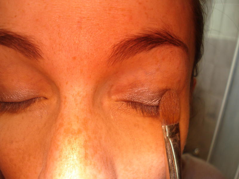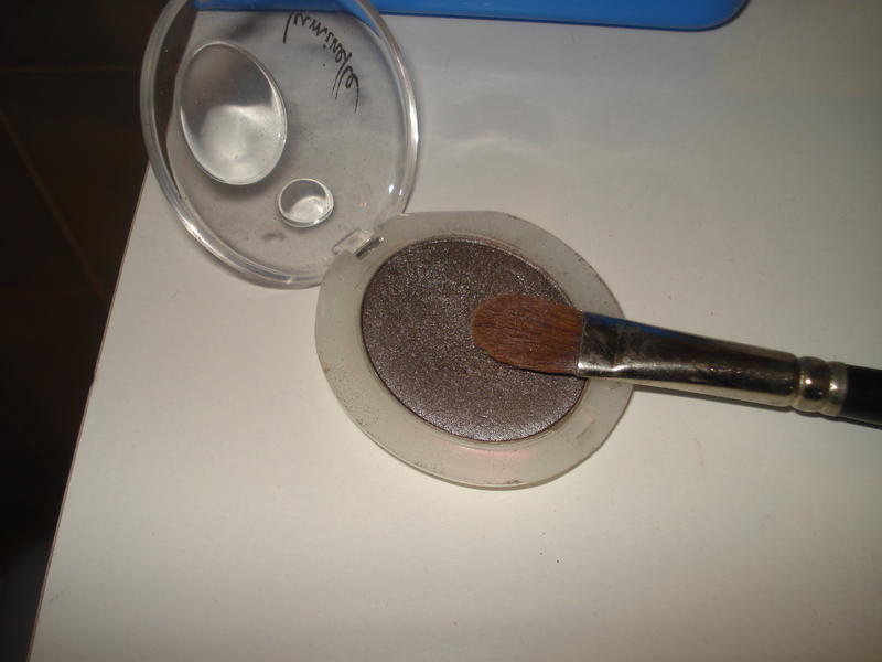 Puis à l'aide du gros pinceaux j' ai appliqué le fard gris luminelle chez yves rocher, le fard va se fixer car il y a un corps gras dessous, toujours de l extérieur vers l'intérieur