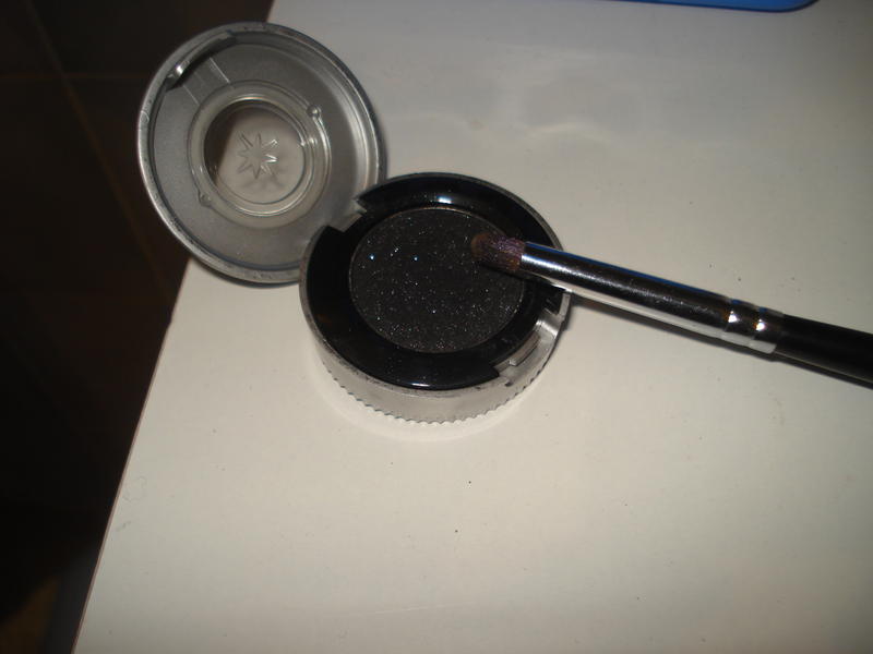 avec le pinceau boule, je prends du fard noir dégrader le de l'extérieur vers la moitié de la paupière. Le bon geste c'est racine des cils et remonter vers le haut de la paupière mobile.puis ne pas déposer des pigment de partout, prélever la matière puis tapoter l excédent sur un mouchoir en papier et appliquer ensuite sur la paupière