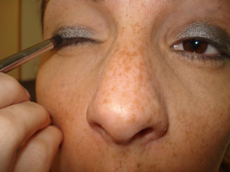 avec un pinceau biseauté prendre du fard gris et faire un rappel a la racine des cils inférieur en tapotant, de l'extérieur vers l intérieur
