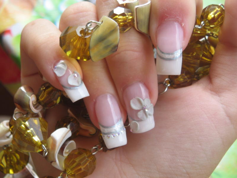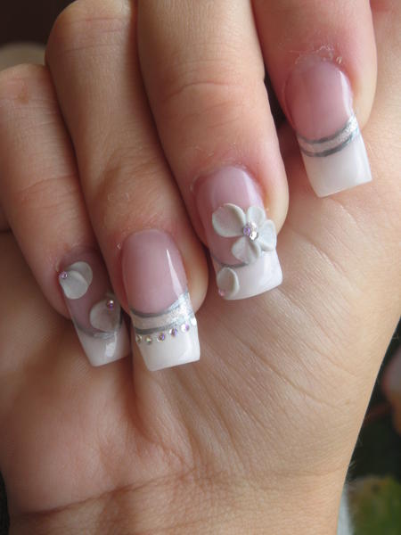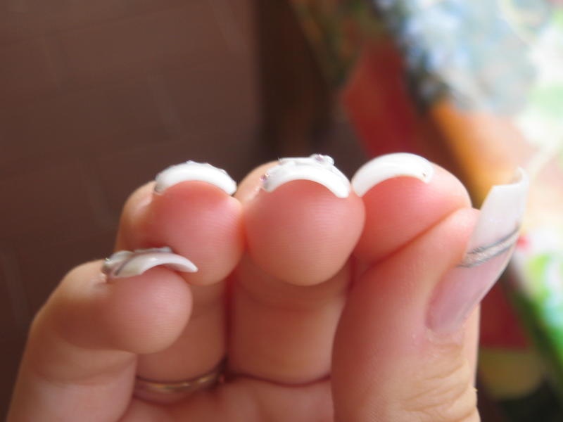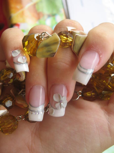 et voilou ma première en résine alors quand je dis première je m'explique... j'ai déjà fais de la résine mais uniquement de la 3D ou rallongement de plaque et je faisais tous le reste au gel (french, construction, finition) mis à part ça jamais de construction en intégrale!!! j'ai essayé donc la façon à poly: french inversée je crois que c'est comme ça qu'on dit mais suis pas sure hihihi (pour les débutante j'explique on fait sont rallongement de plaque et on dessine déjà son sourir et on vient y emboiter sa french ensuite pour finir on met sa clear) alors je suis pas trop contente de l'aspect final (forme des ongles, bombé peut etre mal placé et bien d'autre choses...) mais bon je me dis que c'est une première et que je ferais mieux sur ma deuxième main (enfin y a intêret sinon coup de pied au cul!!!!) en ce qui concerne les décos liners flexbrush, micro strass professionnails, 3D (résine nfu oh et pour la construction nsi finition glaze'n go )