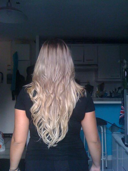 Il a voulu qu'on change un peu donc il ma fait une couleur "cascading" il ma fait marron clair glacé aux racines,blond foncé au 1/4 des longueur et platine au pointes,la il ma fait des boucles au fer à lisser