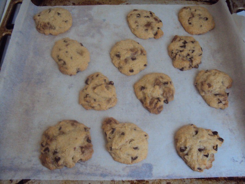 -sur une plaque, y placer du papier sulfurisé, et faire des boule de pate (environ une cuillere a soupe) que l'on depose sur le papier, en les applatissant a peine (ca va s'etaler lors de la cuisson, bien penser a les espacer)