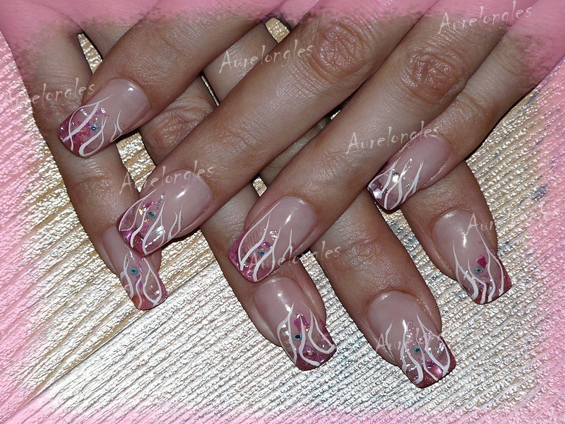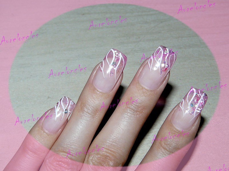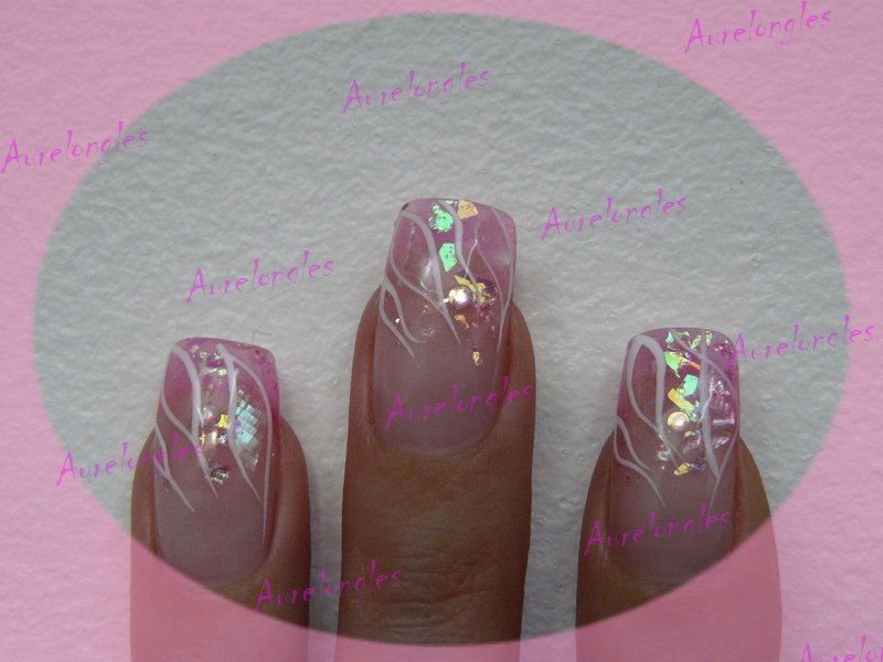 feuille de nacre blanche (tres discret, presque transparente), mylards nfu oh, strass swaro AB, paillettes roses, flex blanc