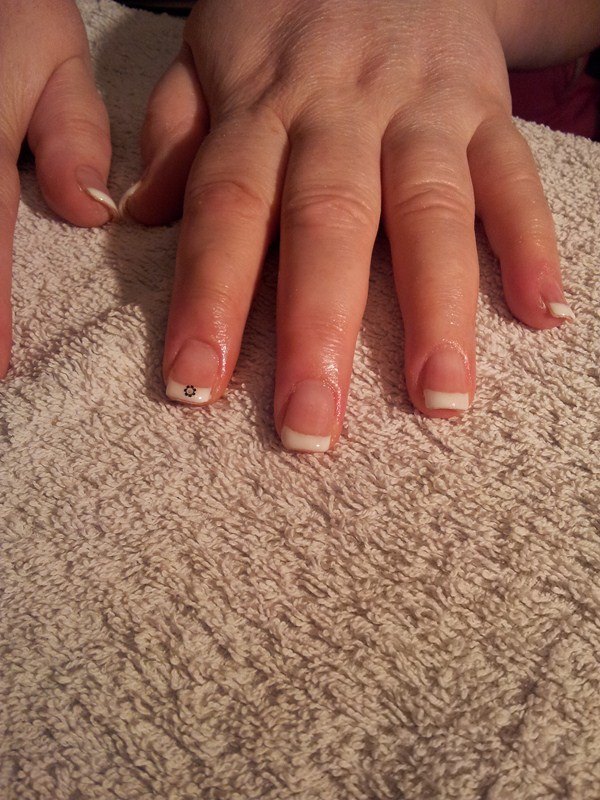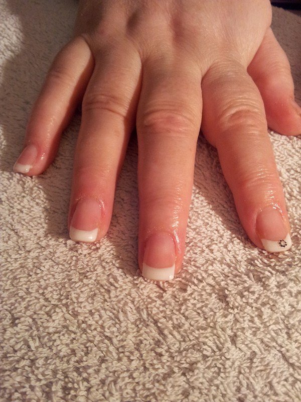 coucou c'est pas facile je suis en formation aussi ! je pense que c un peu trop epais deja tu fai ta french avec quoi pinceau ou spot ? et ton index est un peu pencher il est mal mi en forme mais c un bon debut pour une premiere !