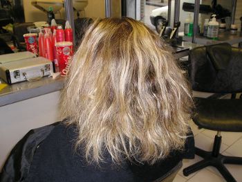 donc jeune fille en école de coiffure à servie de modèle à une petite copine pour des mèches ( mais à la maison sans contrôte d'une prof!!! ) et évidement les mèches on posée trop longtemps, résultat très sec au touché...elle a à part ça un gros cheveu indicipliné qui gonfle facilement après un brush et plusieurs fois coloré éclaircis méché...HA les jeunes!