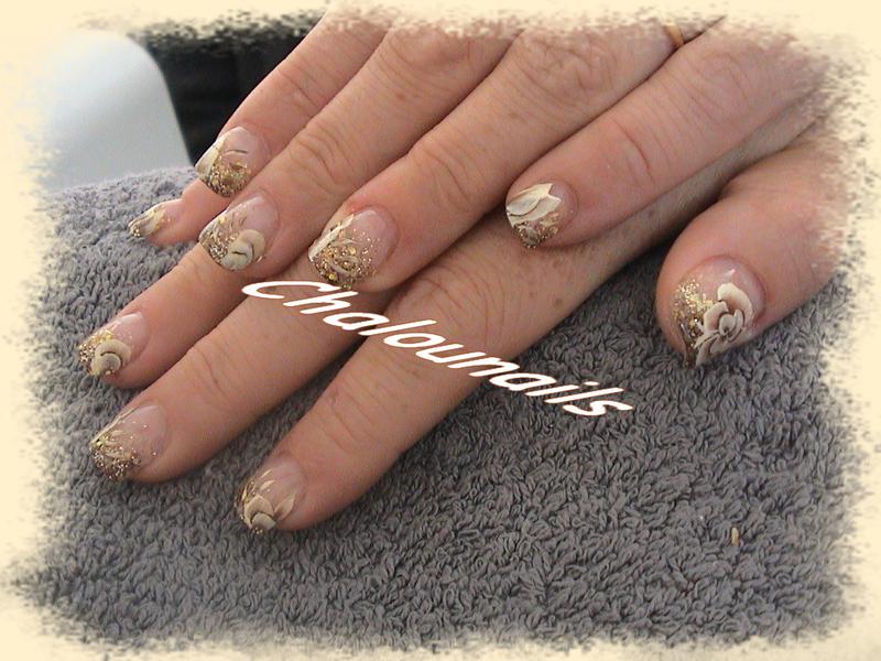 2- remplissage sur belle maman, pose gel, déco sur les index dégradé pailleté marron cuivre or, déco one stroke