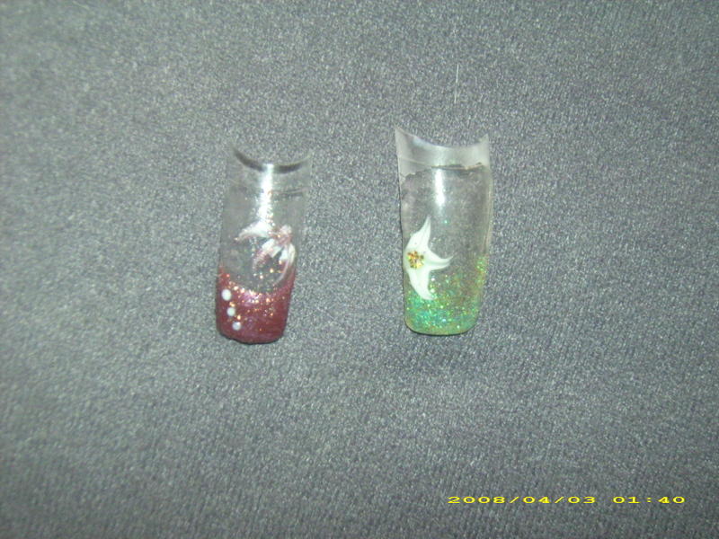 la premiére est la plus belle pour moi je gel de couleur fuschia a été beaucoup plus facile a faire mes fleur et les deux derniére premier test dégradé de paillette sur gel c'est pas top (ché pas si sa marche ainsi lol)sa a l'air plus facile sur résine et pour mes fleur j'ai pris un gel de couleur assez épais et transparent je pense que sais pour sa que sa a foiré