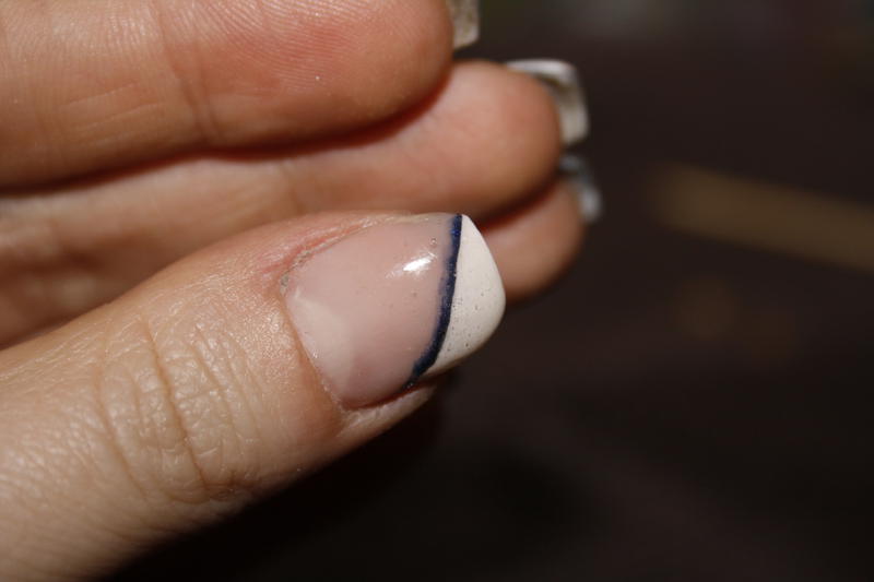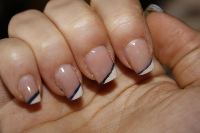 Apres une french classic, la miss voulait une french biais, et j'ai testé pour la premiere fois de mettre un vernis classic sous la french pour l'effet du trait bleu. J'ai nettoyé avec un coton tige imbibé de dissolvant mais ca fait pas net, je testerai les batons qu'on trouve à DM en allemagne.