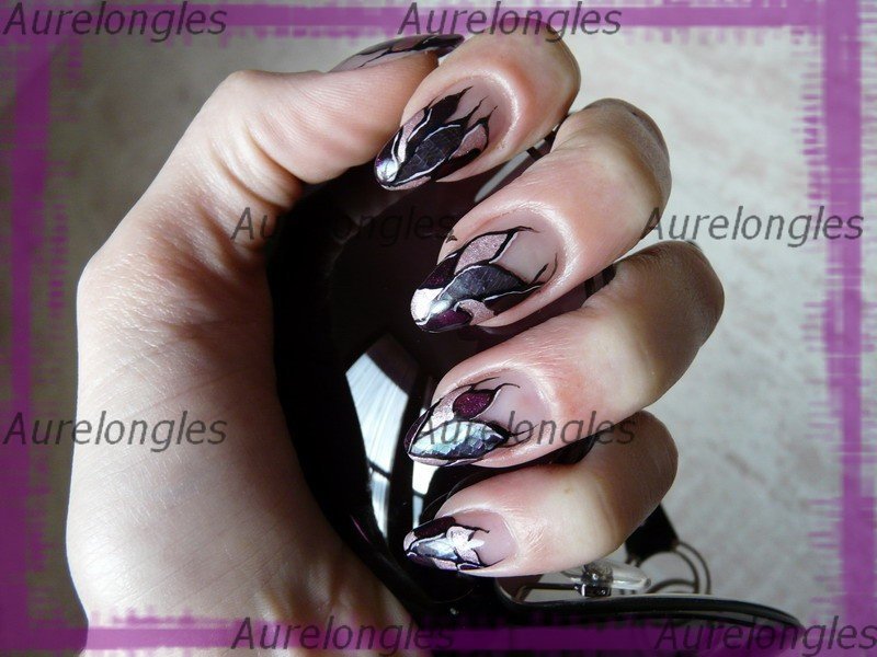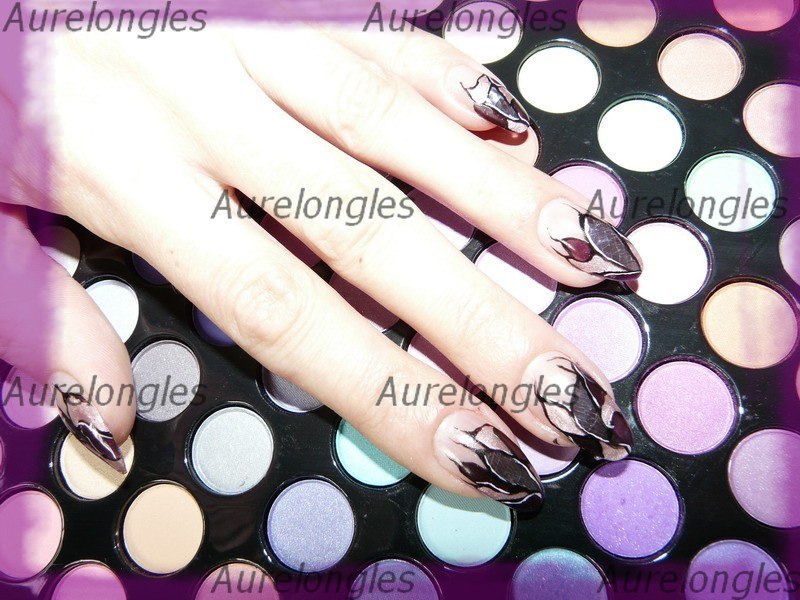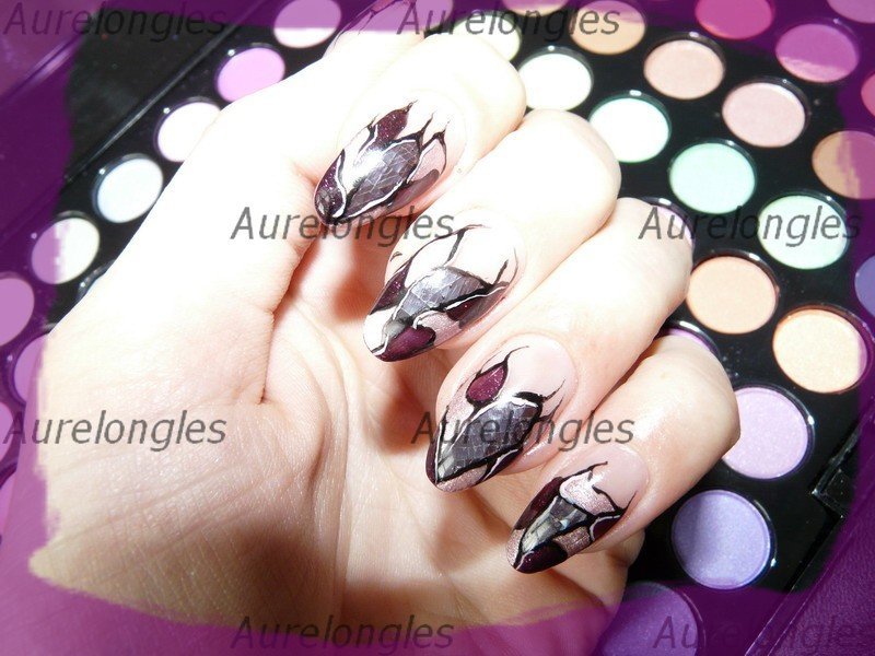 )donc feuilles de nacres sous la construction, fond en peinture acrylique vieux rose et vernis prune, traits noirs a la pebeo