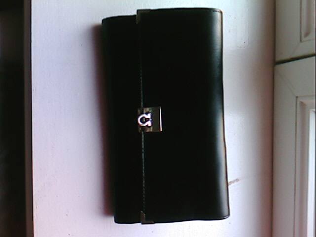 la pochette est en similicuir noir avec système de fermeture en métal argenté.
