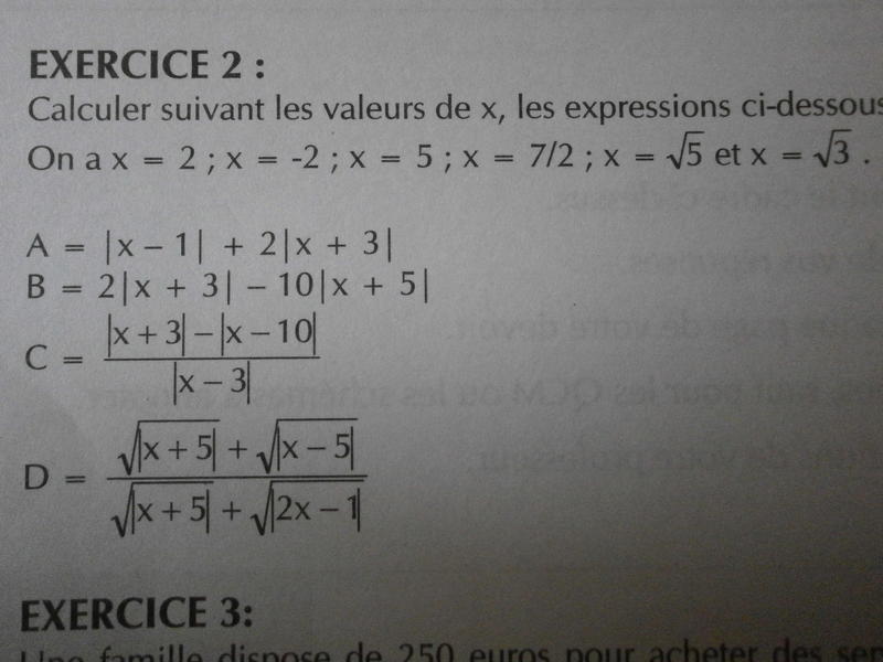 Au départ, il s'agit de calculer C=lx+3l -lx-10l/lx-3l pout x=2. On remplace donc x par 2 dans le calcul. On a alors :
