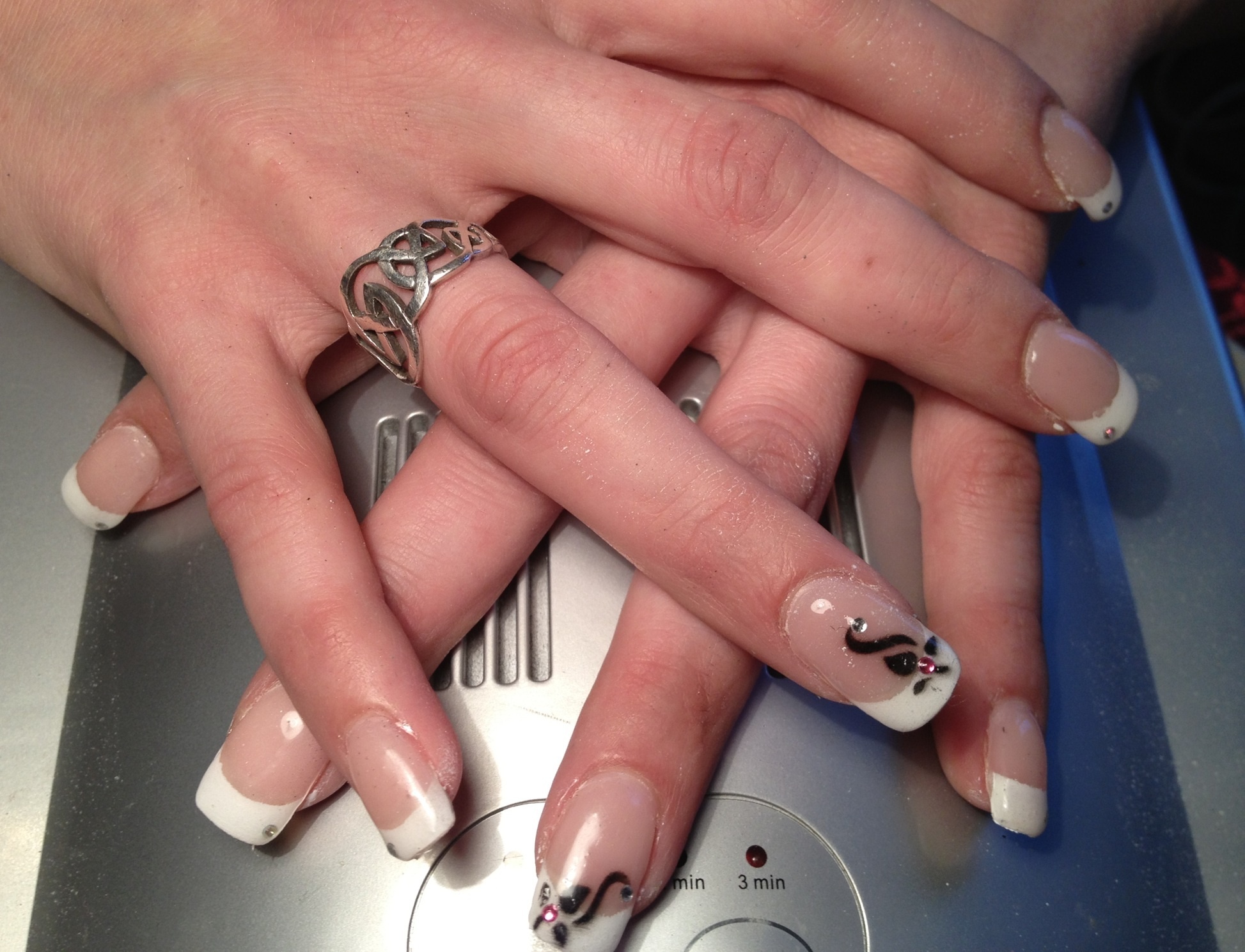 Moi je fait mon gel de construction, je catalyse doigt par doigt après la mains entière, je mais en forme,après je fait la french a l'airbrush voir aussi dessin, je mais sous la lampe, après j'applique une 1er couche de gel de finition, je fait la main entière et je mais un strass si la personne en veut, puis après l'autre, puis j'applique une deuxième couche, puis je catalyse 3 min par mains. Moi c'est comme sa qu'on m'a appris en formation. Et pour le moment jamais u de souci