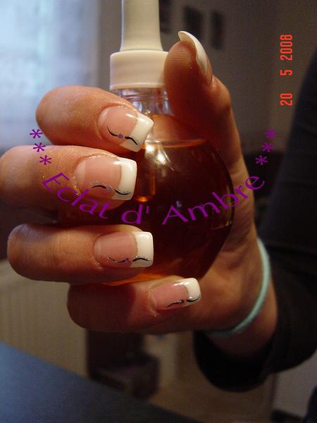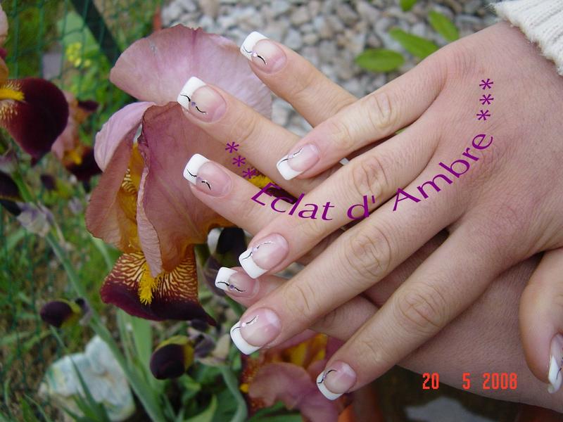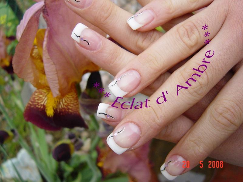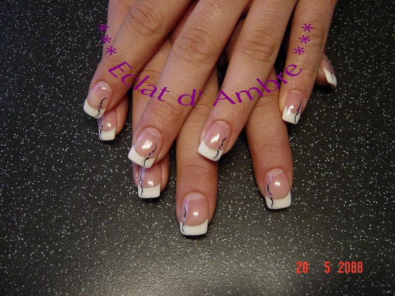 Donc léger rallongement du bord libre pour qu'ils soient tous de la même longueur, french blanche et nail art discret avec liner peinture noir et paillettes argent et strass mauve au centre.