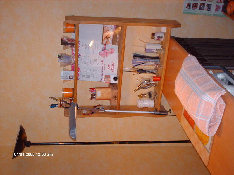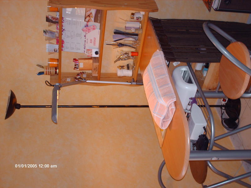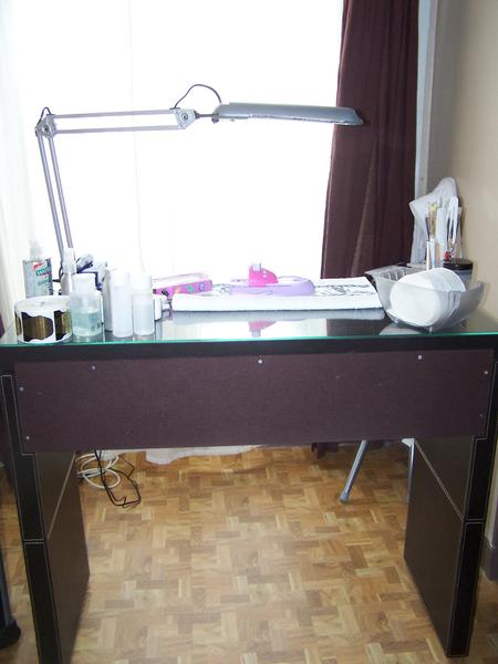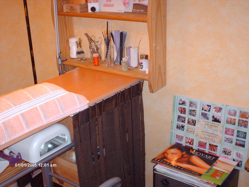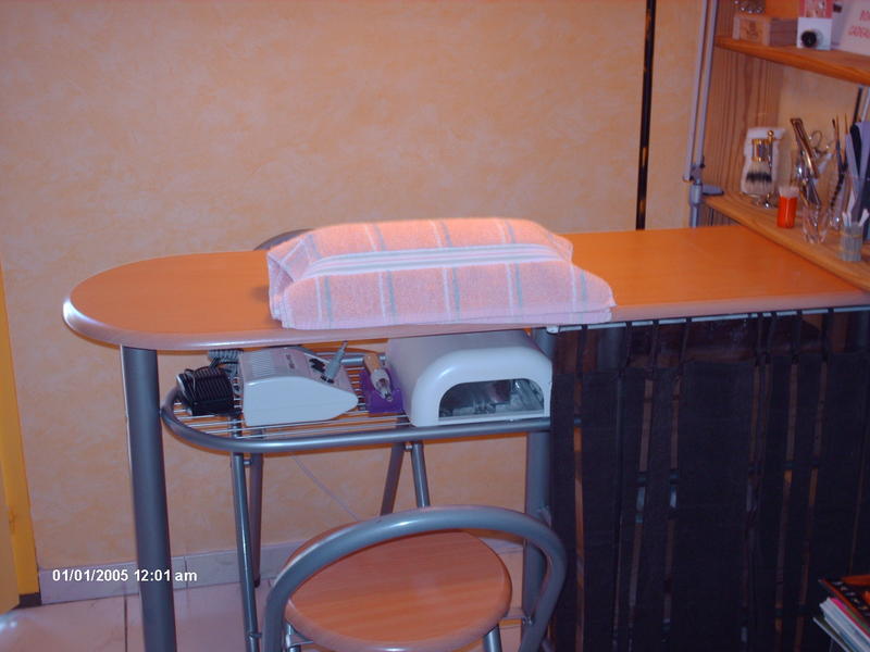 moi j'ai pris un table haute de cuisine avec ses deux chaises style comptoire bar elle a trois etageres ou j'ai recuperais des caisses de vin en bois ( 6bouteilles )qui me serve de tiroir ,j'ai recuperais une etagere mural en bois brut aussi ou je pose cadre produit tarif, deco sur le plateaux sous table j'ai mis la ponseuse et la lampe uv un rideaux pour cache mes boites a vin du coté cliente un petit plateau en verre pour le dessus de la table et le tout cacher derriere un pare vent en fer forgé j'ai mon coin dans mon sejour le tout pour 50€ le prix de la table et les chaises le reste ses recupere