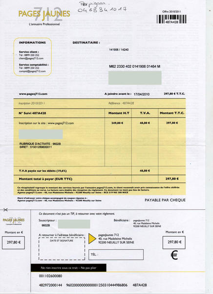 J'ai reçu une facture des pagesjaunes 712 qui à ma connaissance n'existe pas déjà et d'une, ensuite je n'ai signé aucun contrat. Leur téléphone est bidon j'ai essayé de les joindre.