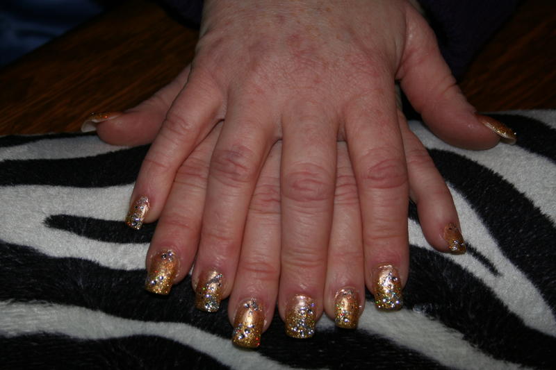 j'ai utilisé un veris base or pour la base puis un degradé paillette or et argent pour les liqne et strass