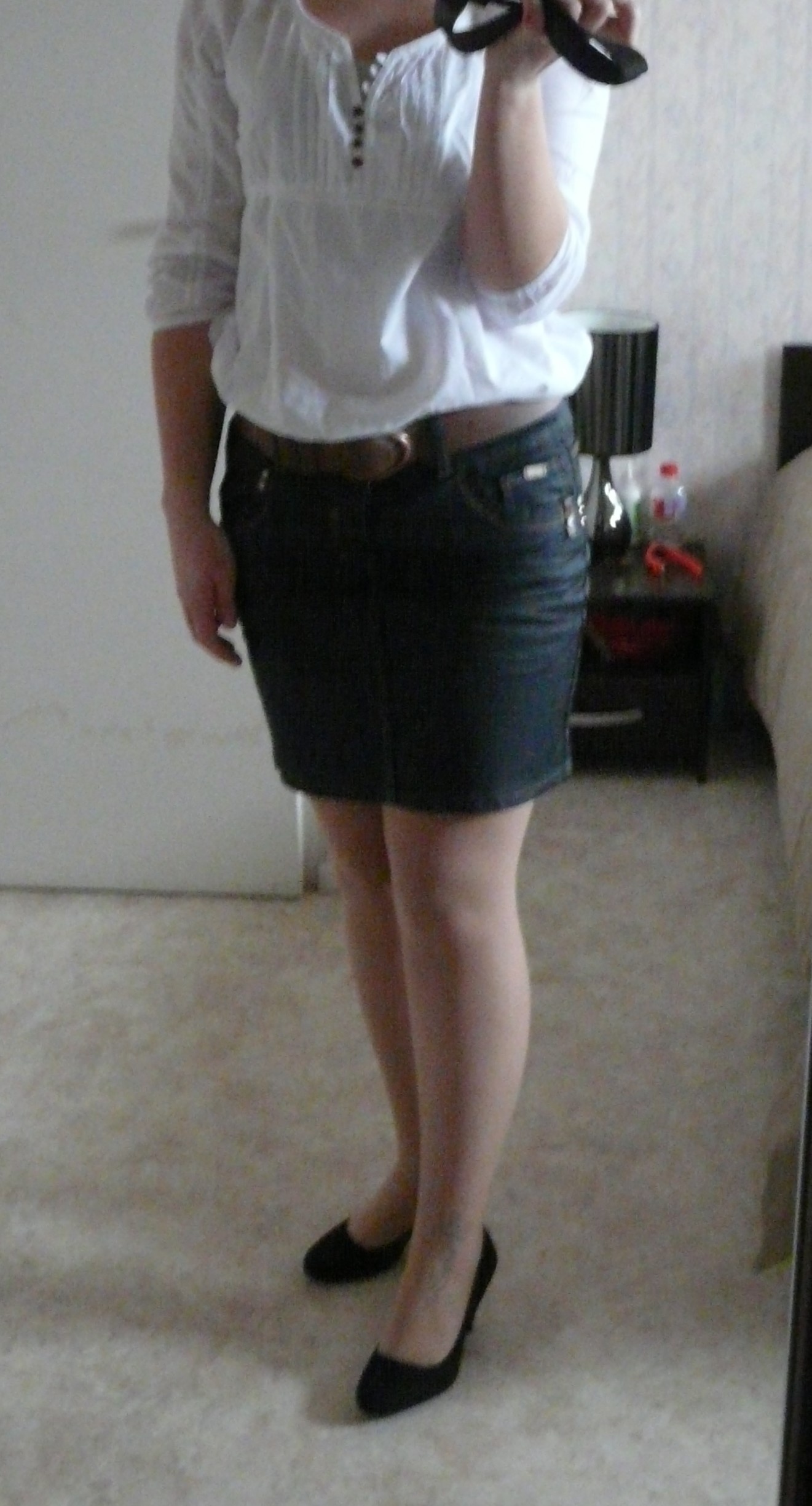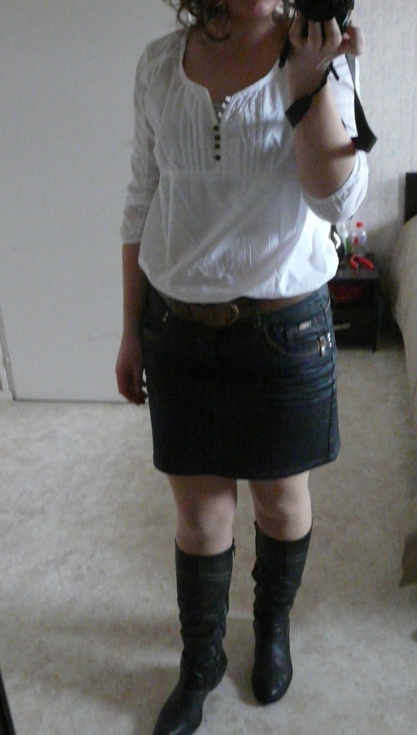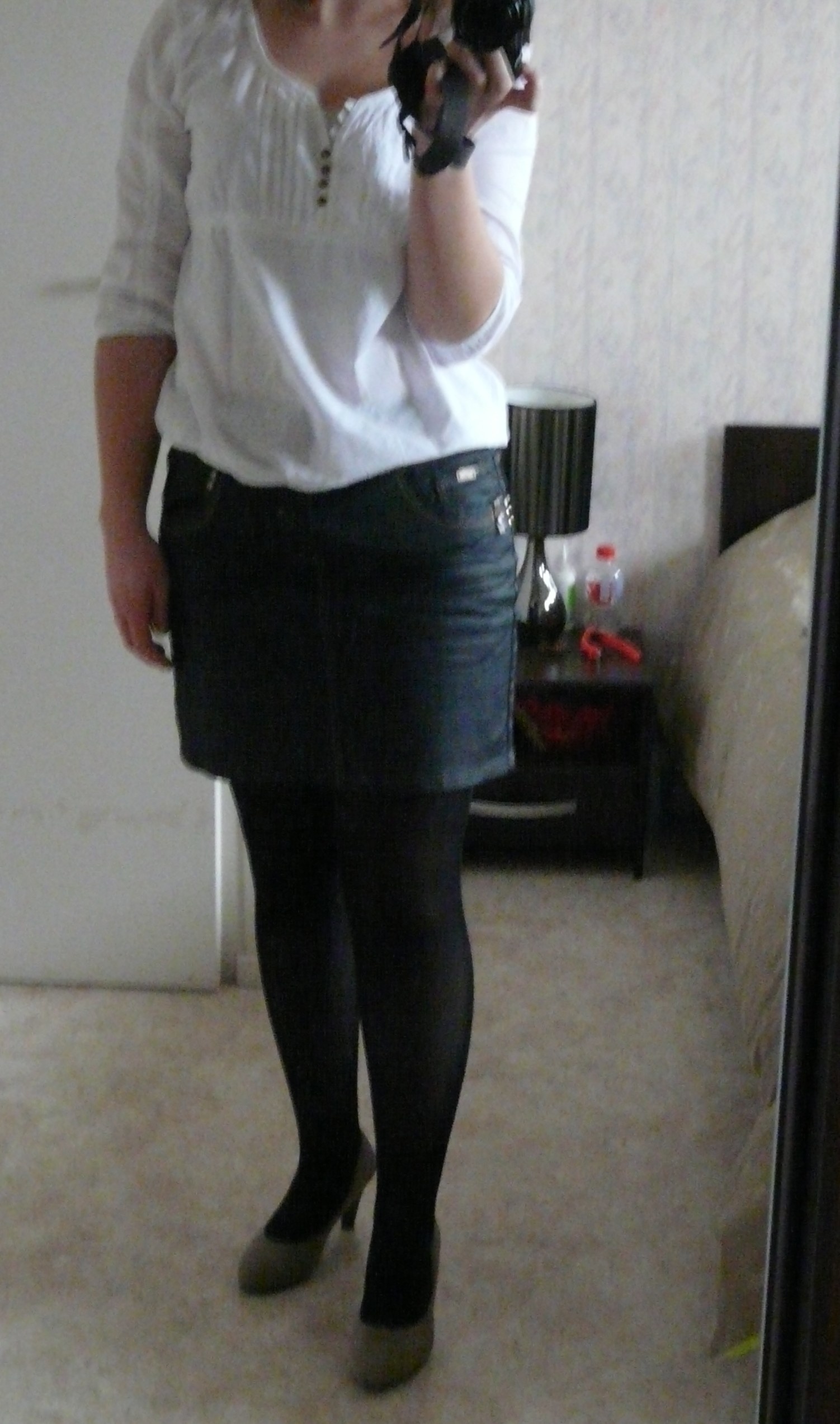 Voilà j'ai acheter cette jupe samedi , elle est noir un peu style "enduit" , je voulai la mettre ce weekend pour les 25ans de ma meilleure amie , je pensai la mettre avec la blouse blanche (ci joint) vous en pensé quoi? et la ou je bloque c'est avec quel style de chaussure avec des escarpins noirs ou bottes?et collant chair ou noir?