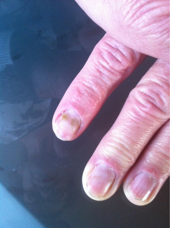 Salut les filles. Je viens vous demander votre avis sur les ongles de ma maman. Elle a eu la riche idée ne pouvant pas attendre de venir me voir pour avoir des jolie ongles de ce coller des faux ongles que l'on trouve au supermarché... C'est pas faire de lui avoir déconseillée... Gggrrrr voilà l'état de ses ongles maintenant avec ces tâches vertes... Vous en pensez quoi? Mycose or not mycose???