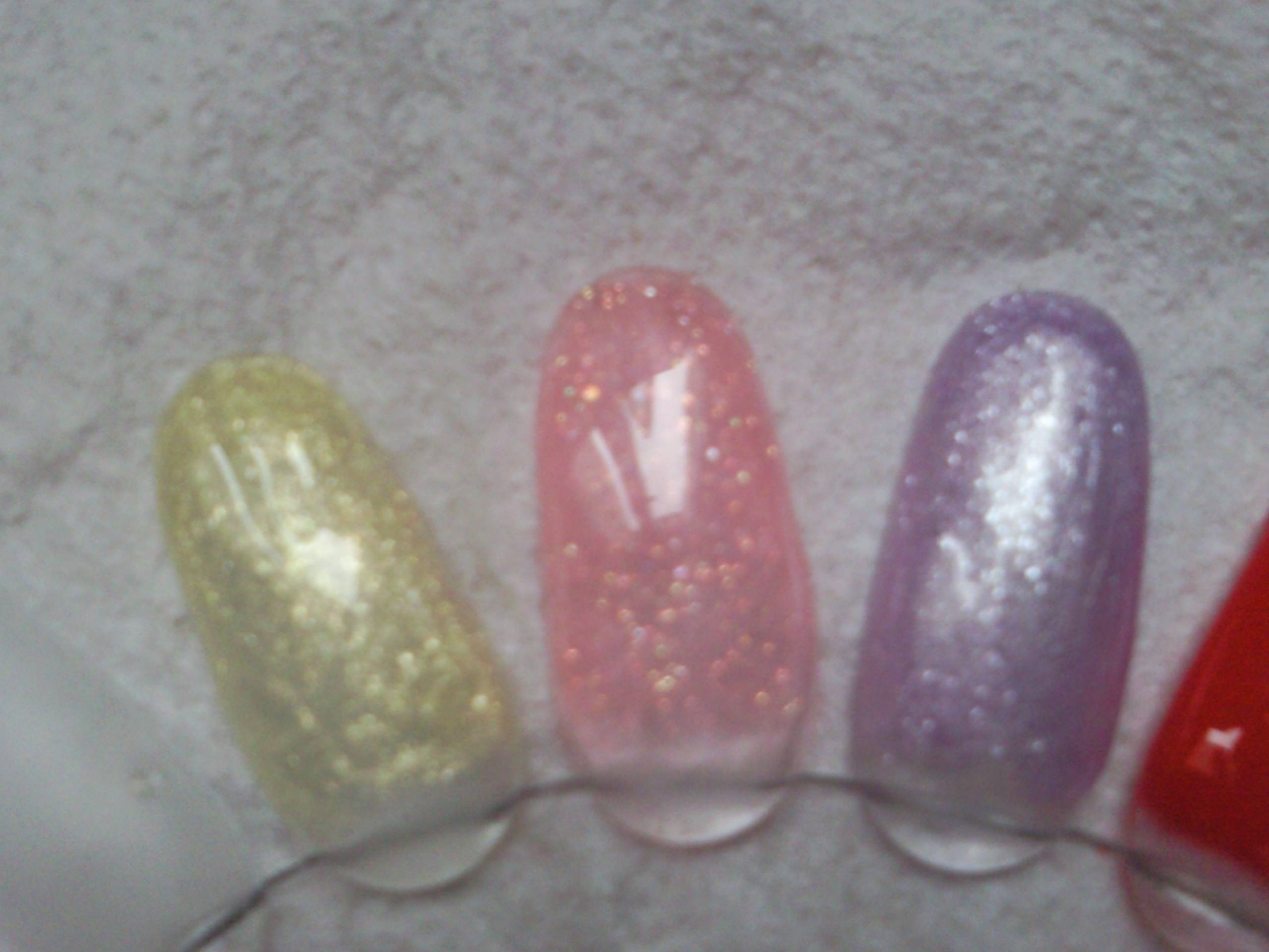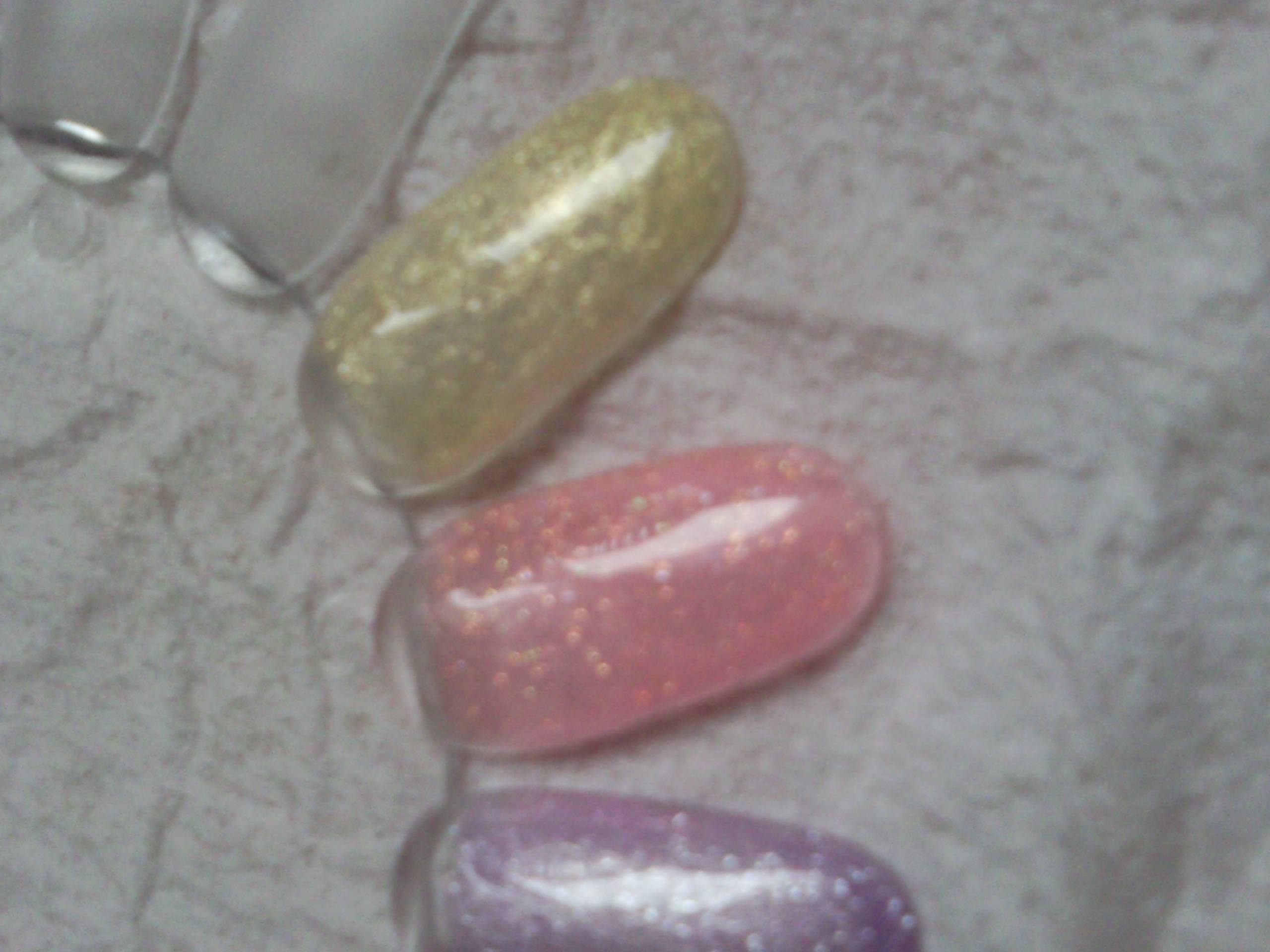 coucou les filles je vous fait voir les gels de couleurs que j ai commander sur onglesetdecos1 ere et 2 eme photo de gauche a droite,or 8108,rose8065,violet8125.3eme photo chair t21,naturel t11,et le orange pastel g8065 qui est en fait du jaune.4 eme photo le gris clair nacre g110 et le noir t 13,pour les gels de la 3eme j ai mis 2 couche pour bien lissé car c est la premiere fois que j utilise des gels aussi épais,j avais commander aussi des paillettes hologramme hexagonale mais ils se sont trompé iils ont mis de la poudre pailleté,donc je leur ai envoyer mail pour qu ils me les envoie,je vous tiens au courant,sinon super couleurs!!!:p