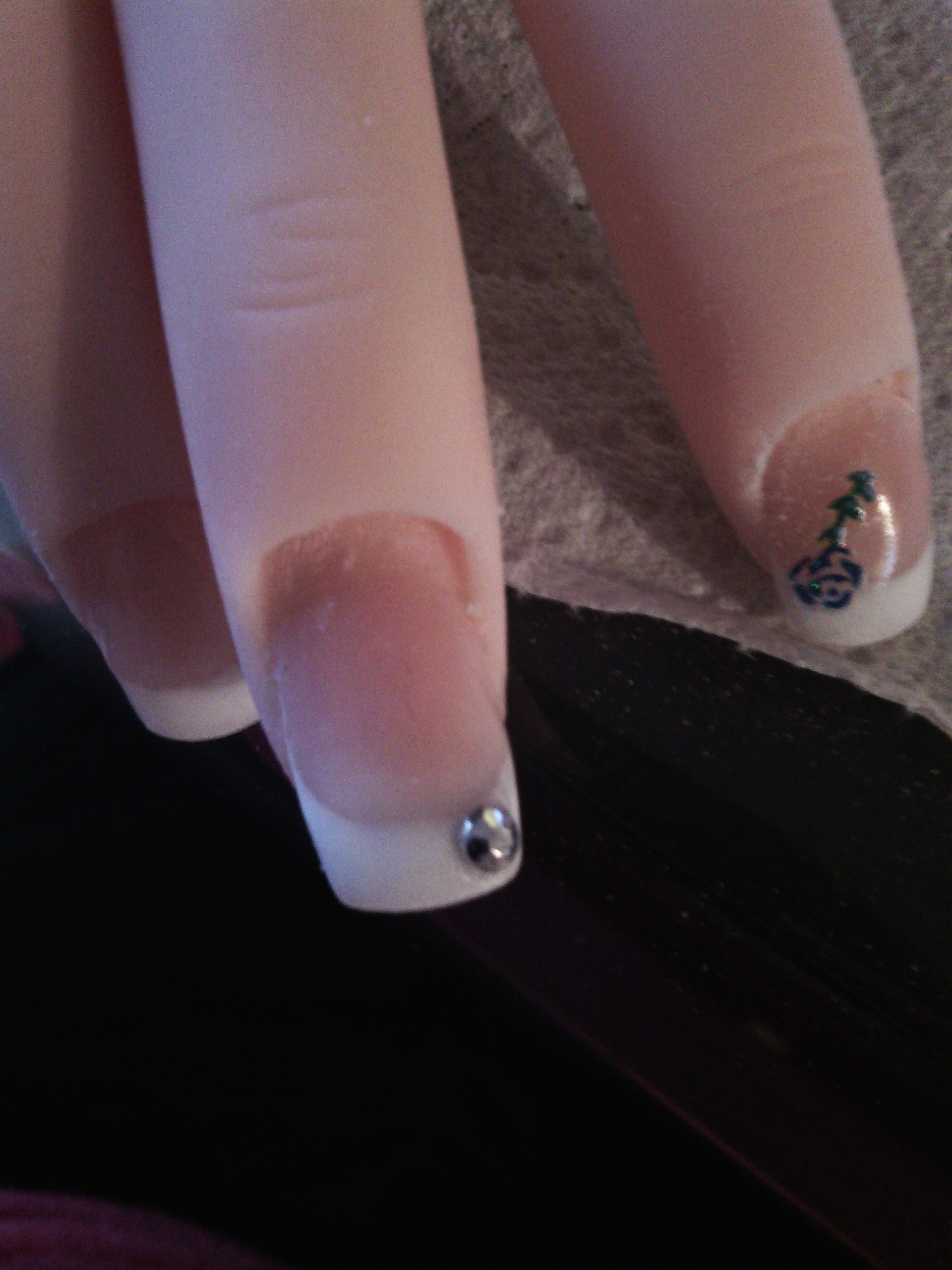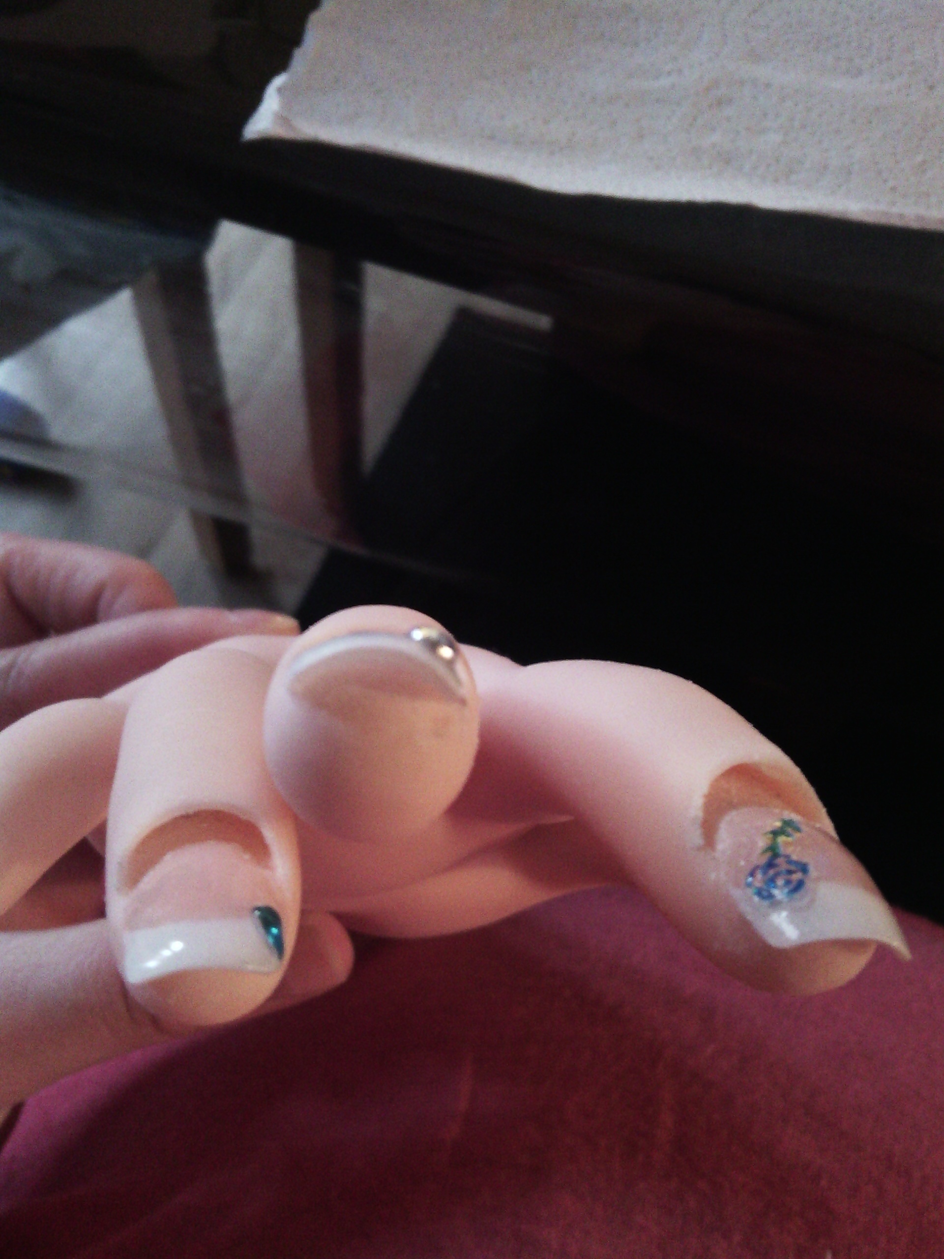 Pose capsule sur main d'entraînement alors avant c'était une capsule de coller limer court qui remplacé l'ongle de la main d'entraînement car elle a pas d'ongle + pose au chablon donc jai fait une déposé jusqu'à l'ongle et jai mis la capsule dessusDéfaut : je pense que j'aurai du faire ma french un.poil plu haut car malgré l'utilisation de gel de camouflage on voit un truc blanc transparent sûrement l'ongle dessous....