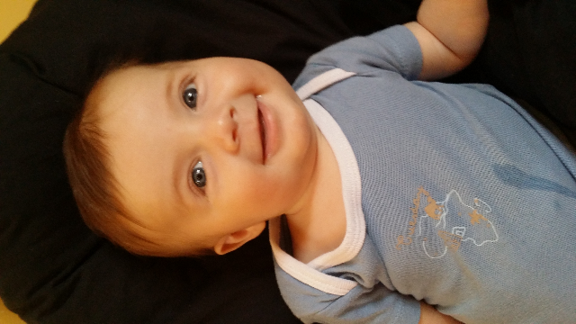 Trop beau !!!!Je suis fan il arrête pas de sourire de gazouiller lol j espère il va garder ses yeux bleu et haï hâte de passer au petit pot hihihi