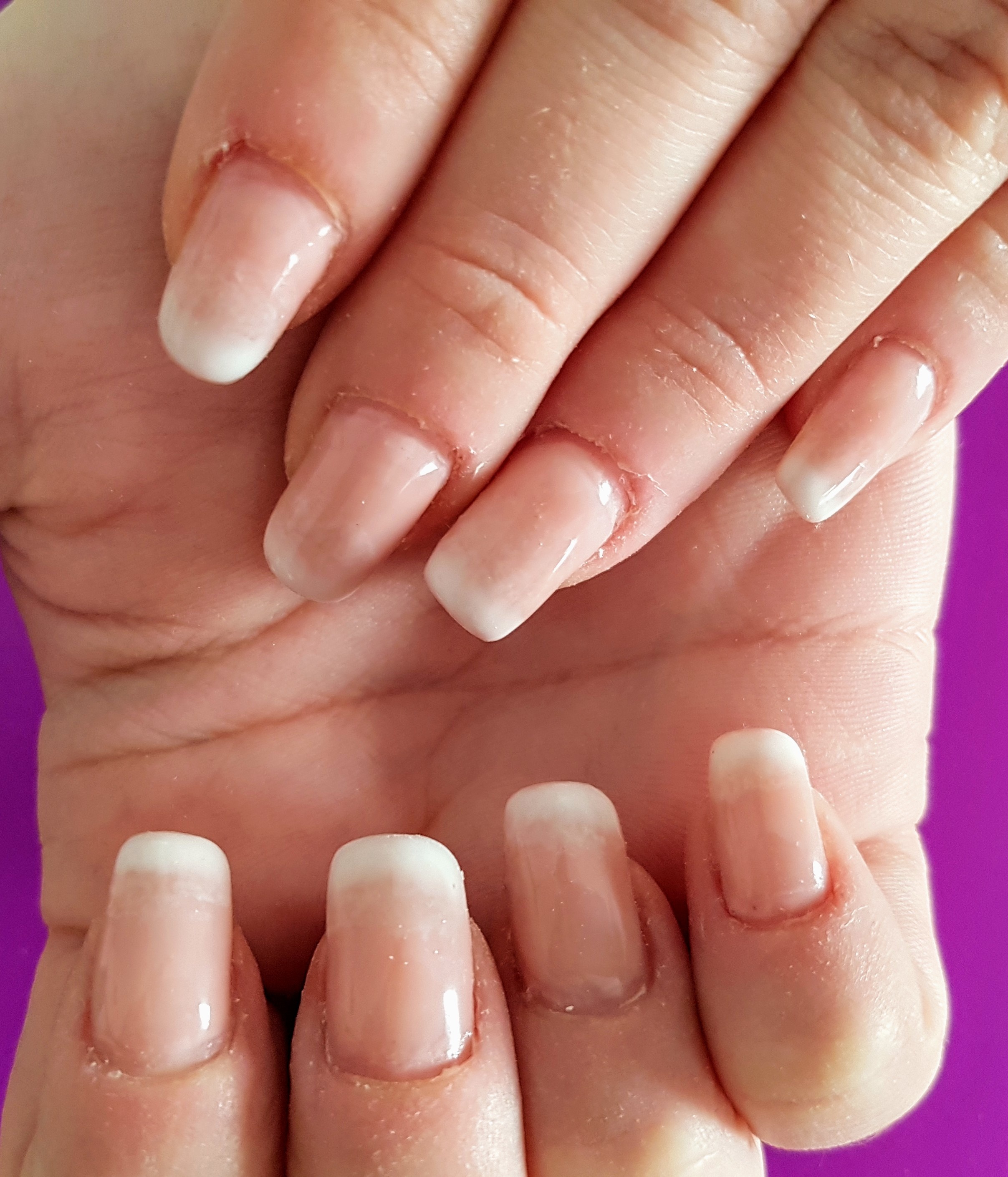 J'essaie désespérément de faire un french baby-boomers en vernis semi permanent.. j'ai essayé à l'éponge (le semi est bu en grande partie par l'éponge et le reste fait des petites bulles quand on tamponne l'ongle-->pas net ), j'ai essayé avec un pinceau nail art en mélangeant le blanc et le rose(--> pas net et moche), j'ai essayé avec une ombre à paupière en tapotant avec le doigt (-->pas de dégradé )..