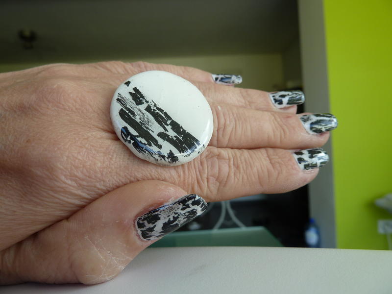 Je fixe le "médaillon" au support tout à la fin, une fois la déco terminée, la finition catalysée et dégraissée. Une fois fixée, je place la bague dans un présentoir et je maes une couche de top coat pour la faire briller.