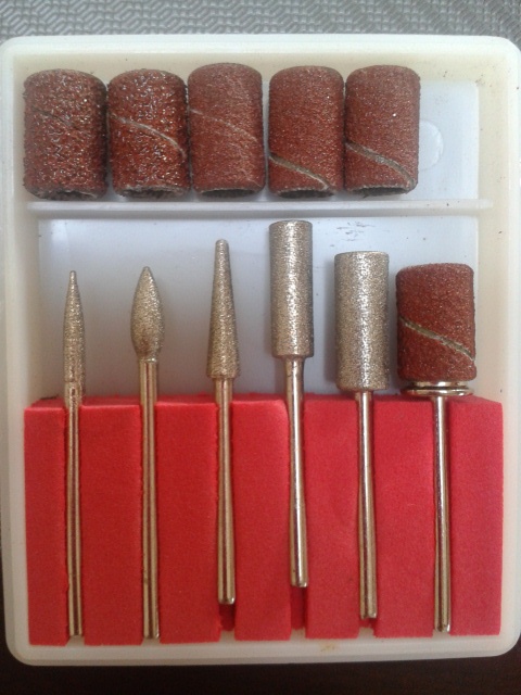 de mémoire .....euh les deux plus fins c'est pour les cuticules et nettoyer dessous de l'ongles a la fin de ta poses et les deux plus gros c'est pour le modelage et éliminer le gel lors d'un remplissage celui du milieu je ne sais pas les embouts en émeri je ne sais pas non plus