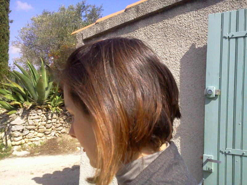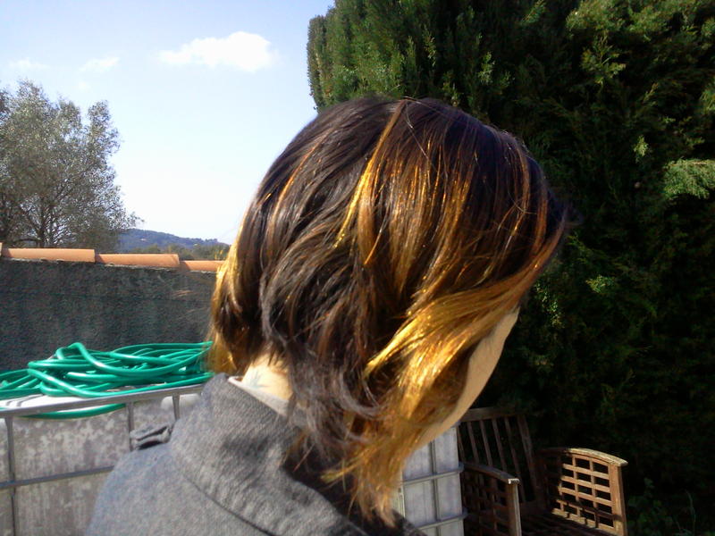 ps: la première photo ces cheveux on l'air jaune mais non c'est le soleil mais au moins vous voyez derrière la marque de ces pointes!!!
