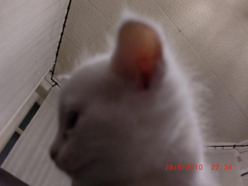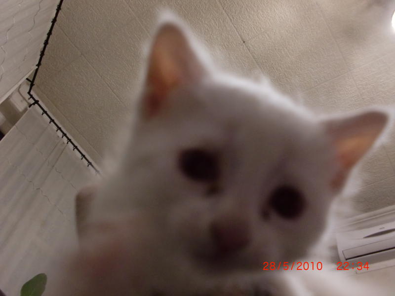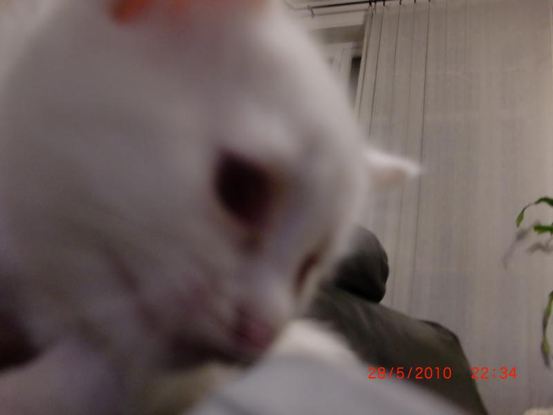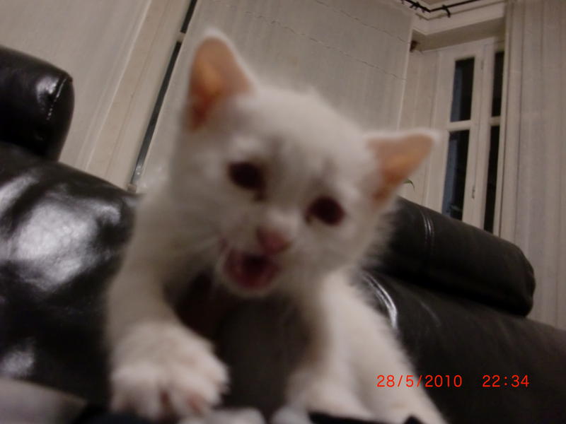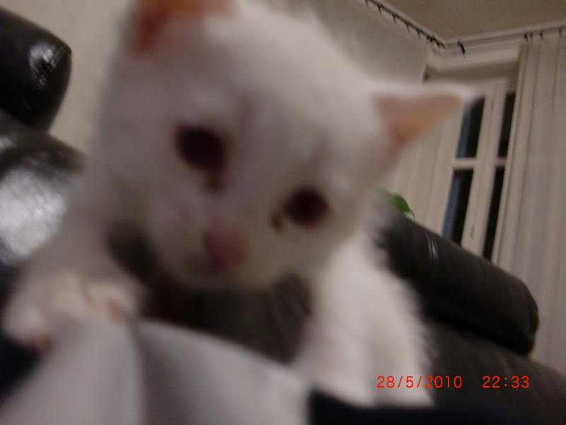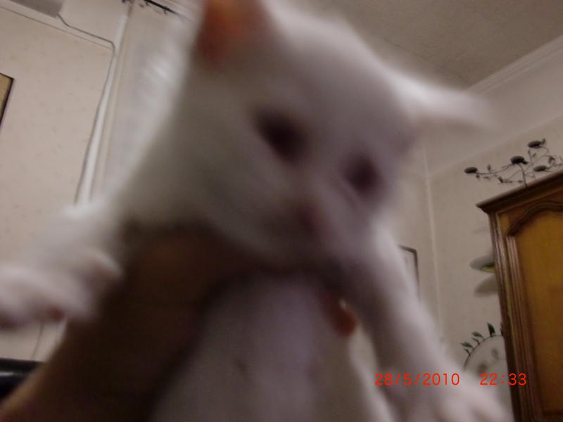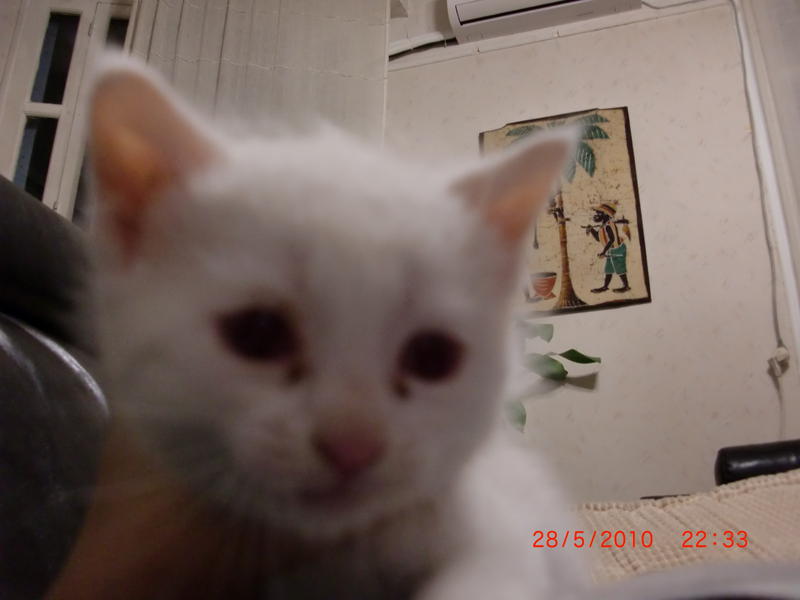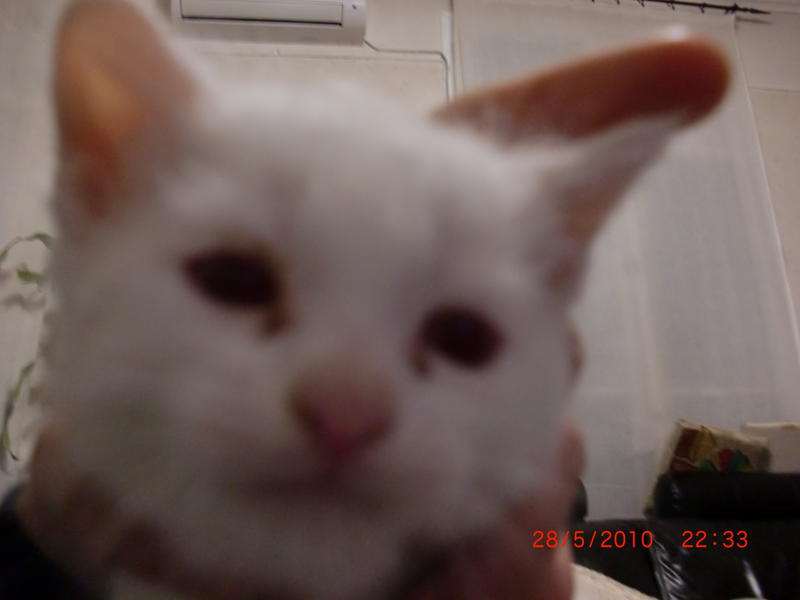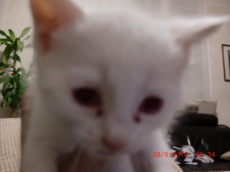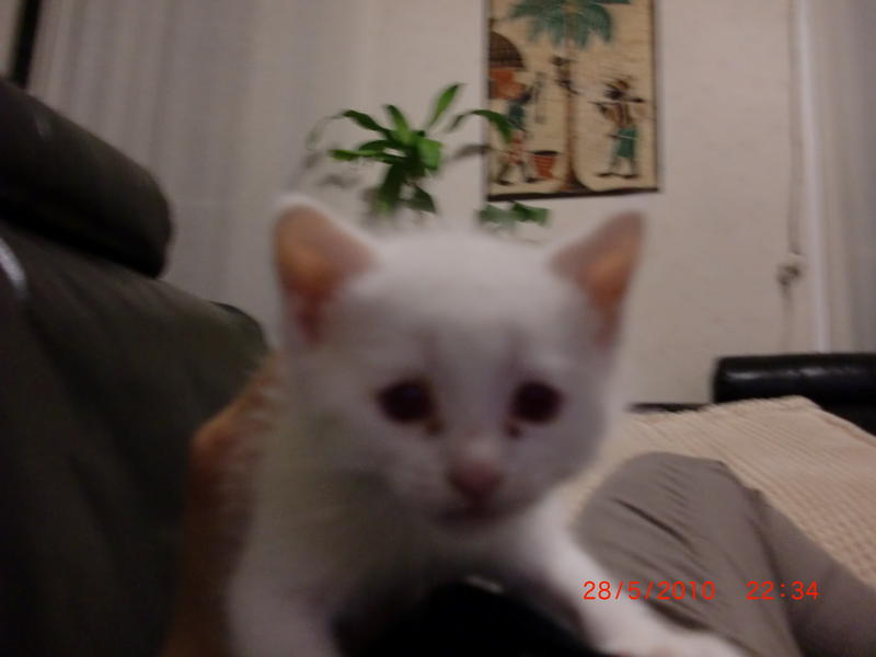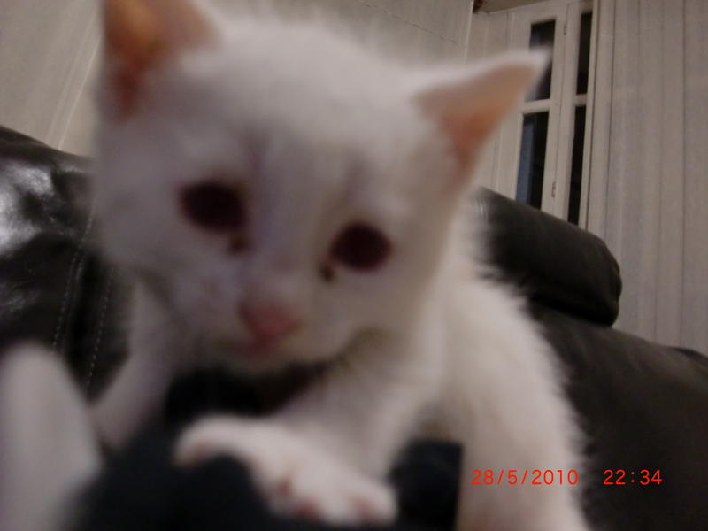 Concernant ses yeux, d'après ce que tu décris, soit il a une source de lumière dans l'oeil au moment ou tu regardes, soit il est albinos. Demande aussi au vétérinaire de vérifier s'il entend bien car parfois, les chats blancs aux yeux bleus sont sourds.
