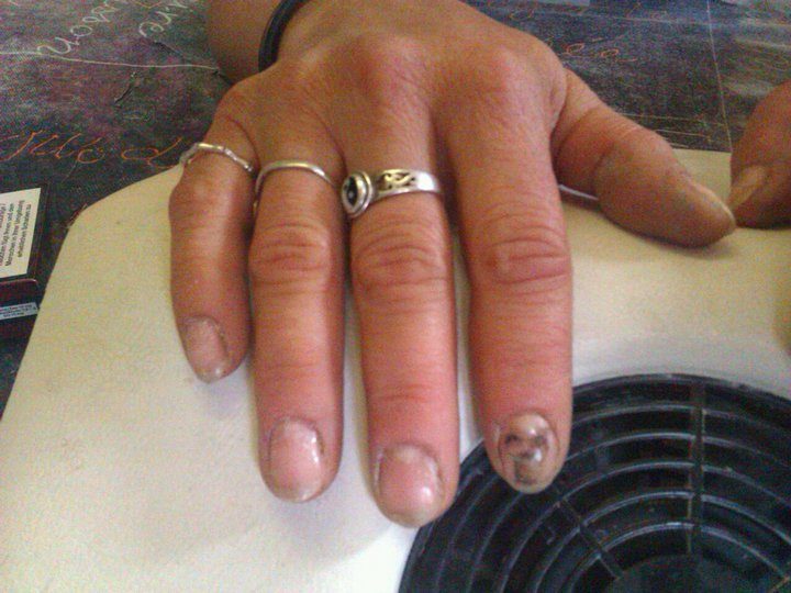 en fait elle c coinser le doigt et maintenant il est noir mais voila elle c fait faire les ongle il y a environ 1 mois et sson ongle et en train de tombe