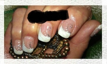 Elle m'envoie la photo, french blanc, avec des petits points blancs et une arabesque en paillettes, idem jusque là tout là vas bien ....