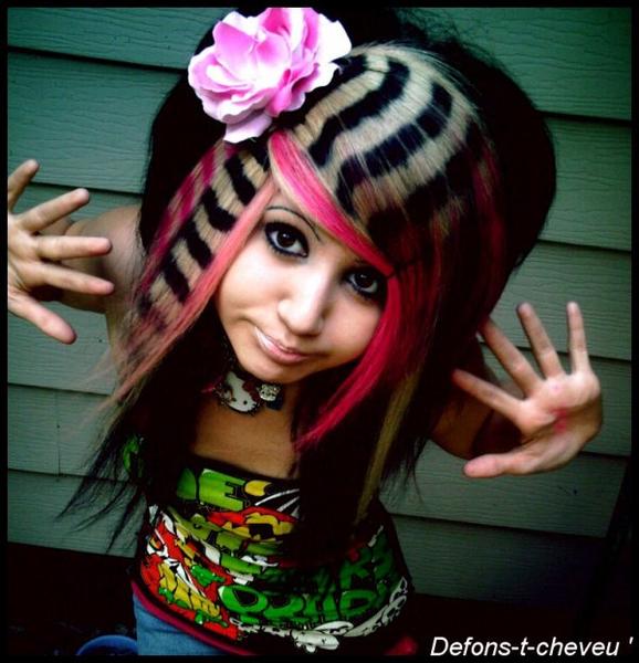 le badeau nor je ne vois pas trop ce que tu veux dire mais moi j'aurais bien vu une zébré je sais pas trop comment l'expliquer mais cela ferait blond noir blond noir ... mais perpendiculaire au cheveu si tu voix ce que je veux dire lol ça fait zébré en quelque sorte je ne sais plus comment on appelle ces méches