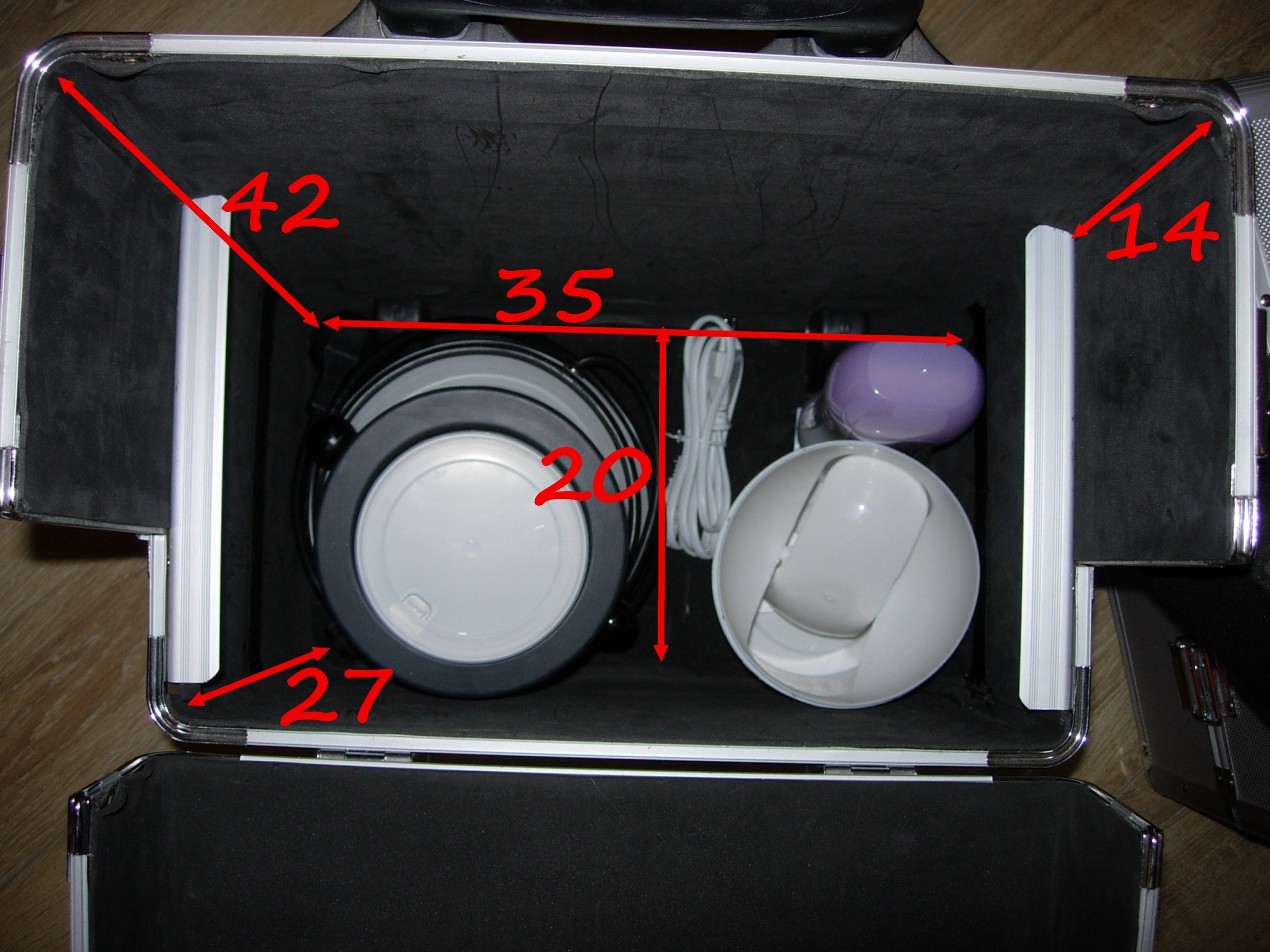 Alors voilà (je précise que je ne m'en sers que pour stocker mes produits/matériel qu'il me reste, ne faisant plus d'esthétique ;) ) donc j'ai essayer de mettre mes trucs en fonction de ce que tu emmènes ! Pour te donner une idée du rangement du fond, il ne manquerait pas grand chose pour mettre 2 chauffe cire 800 donc je pense que tu pourras mettre ton chauffe cire + ton chauffe double cartouche + ta poubelle au dessus (la mienne doit etre un peu plus petite que la tienne. Pour le rangement juste au dessus (panier avec compartiment amovible) tu peux mettre une bouteille de 14cm de haut. Et pour la malette, les compartiments sont amovibles aussi. Je t'ai mis les dimensions si ça peut t'aider ;) Voilou, n'hésites pas