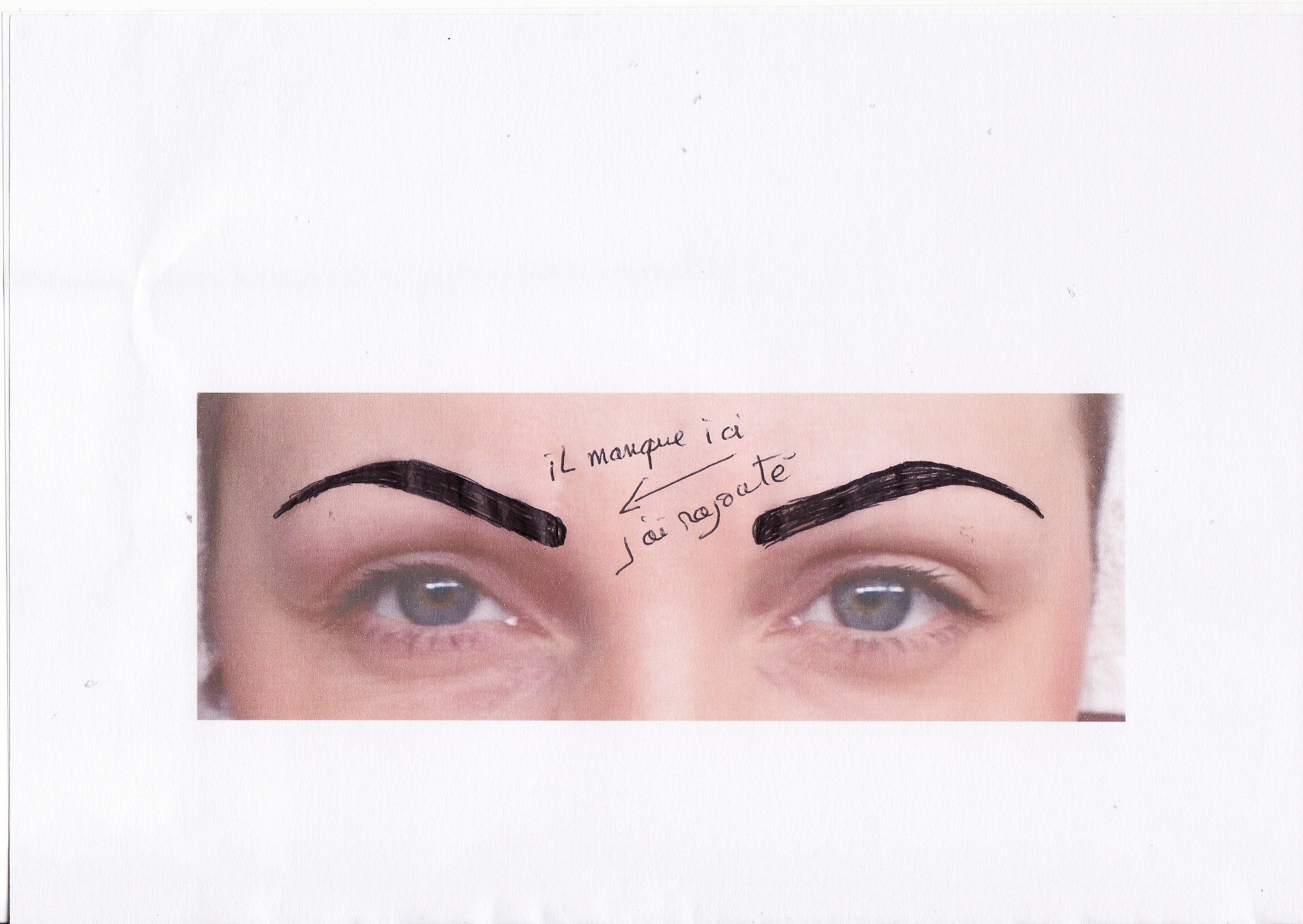 Je me suis permise d'imprimer la photo de vos sourcils et de faire des corrections au stylo. Evidement il faudra que votre dermographe tienne compte de vos lignes de visage mais il me semble que les deux sourcils ne commencent pas au même endroit.