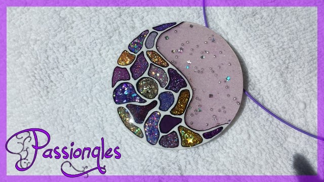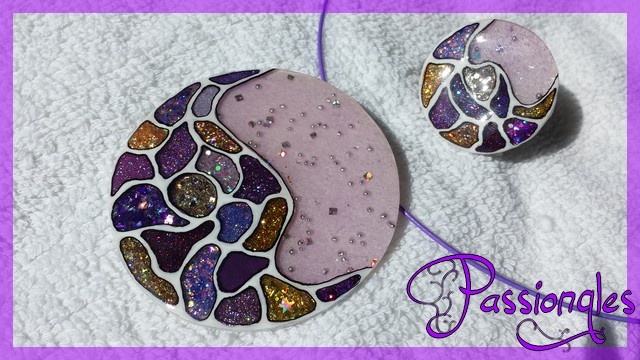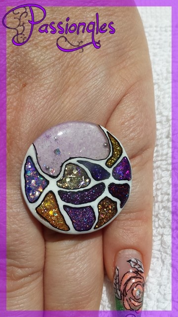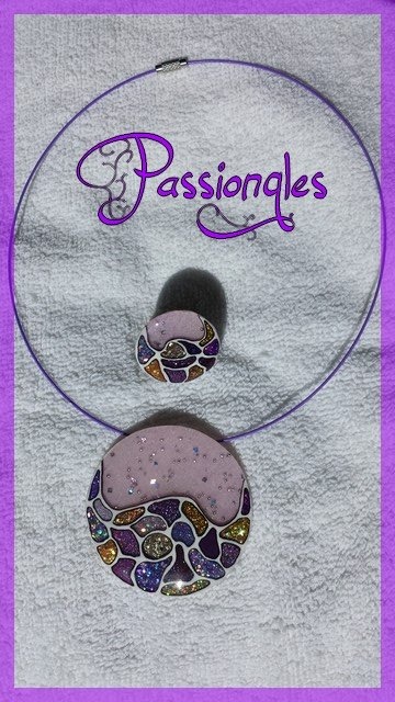 Premiere parure bague et collier pour une grand mère qui adore le mauve, les paillettes et le doré.