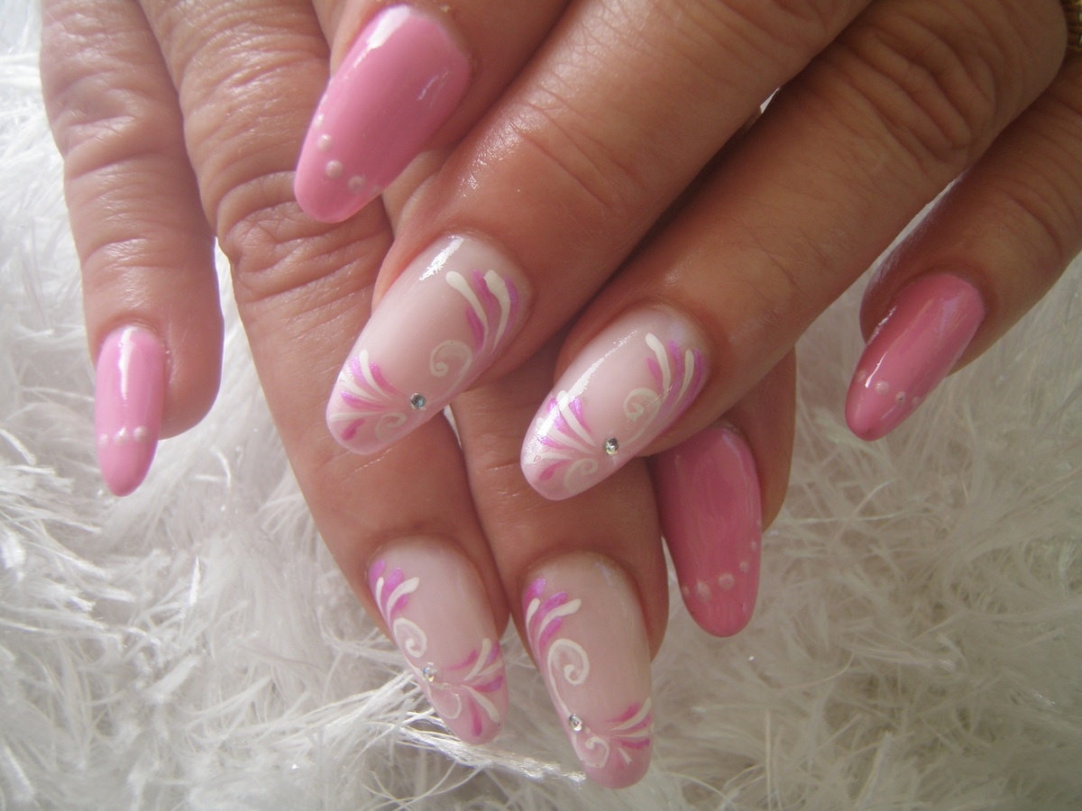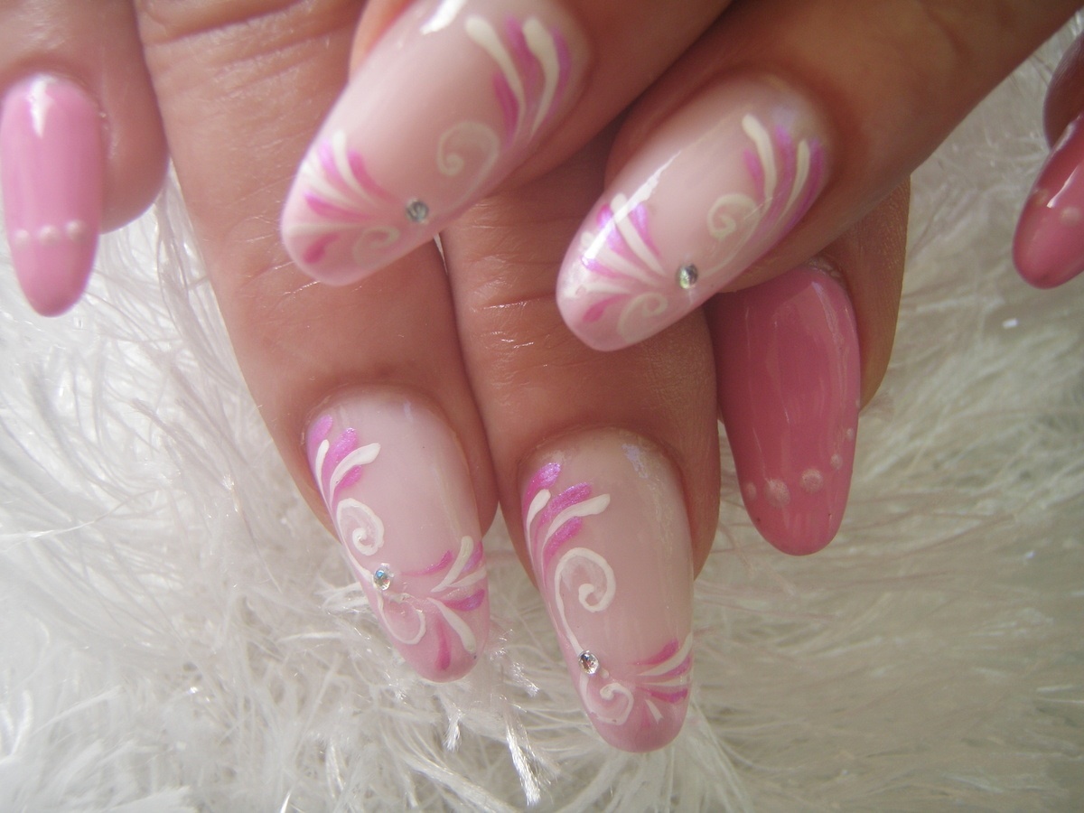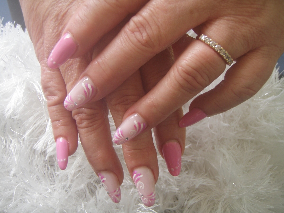 French en biais sur l'annulaire et le majeur avec un mélange de vernis permanent lolipop de chez Beautynails et un gel paint blanc nacré de chez Nefertiti, peinture acrylique, minis strass.