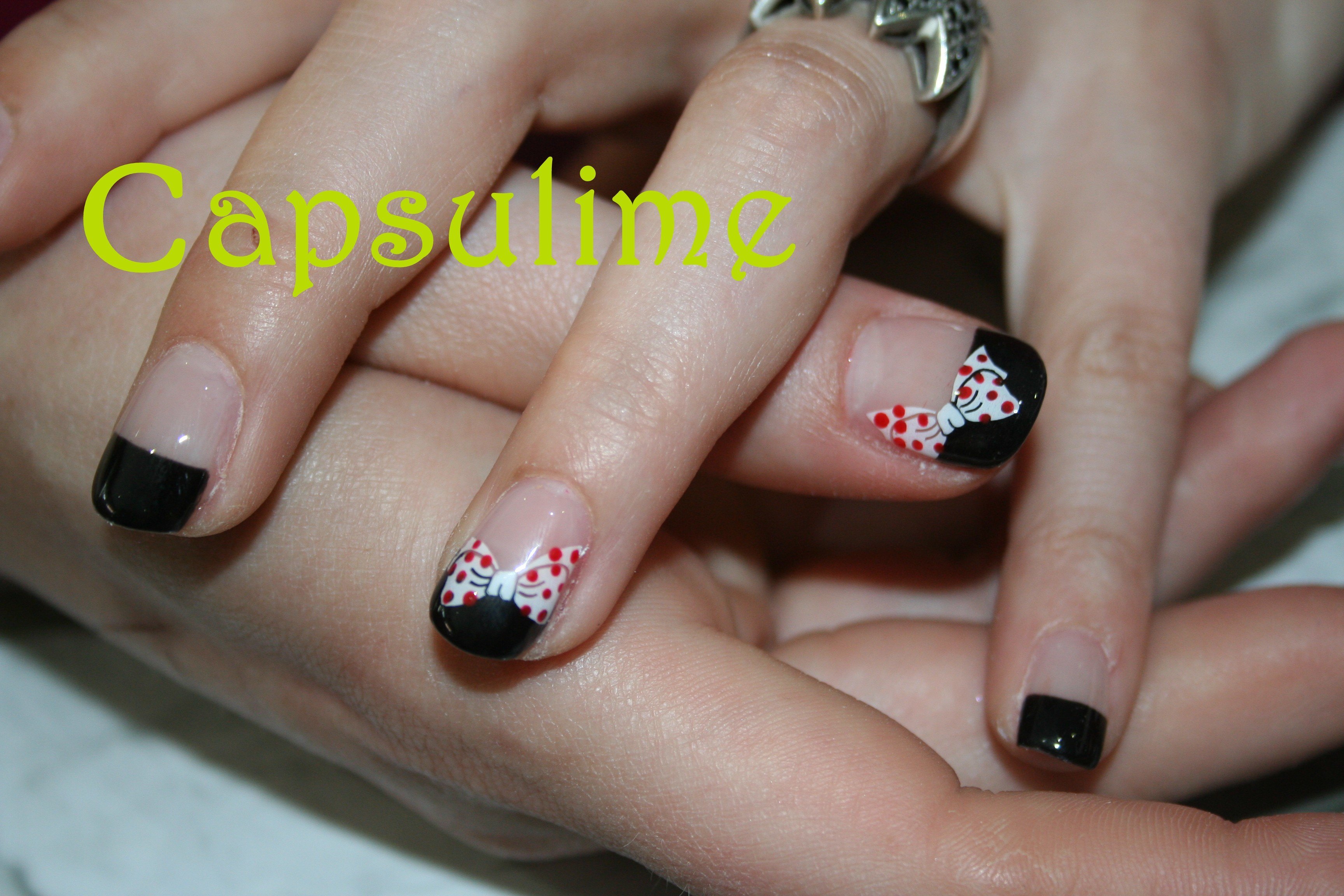 ta pose sur la 7e photo (french noire avec 1 gros noeuds blanc a pois rouge), le noeud c'est un stamping il me semble.