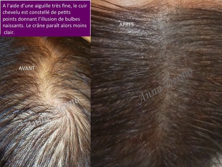 Voici un exemple d'avant / après de pigmentation réparatrice du cuir chevelu. La couleur utilisée n'est pas du noir mais un marron foncé à dominante chaude pour éviter que cela ne vieillisse gris. Le crâne est en effet très exposé aux rayons UV même en plein hiver.