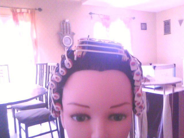 Alors aujourd'hui j'ai tenté aussi une perm' mais c'était une vraie galère, parce que ma tête avait les cheveux trop court et j'avais des bigoudis moyen, j'ai mis 3 plombes à faire mes séparations, et l'enroulage au début ça ne tenait pas bien mais à force de persévérance vers la fin ça tenait mieux mais y a encore du boulot...