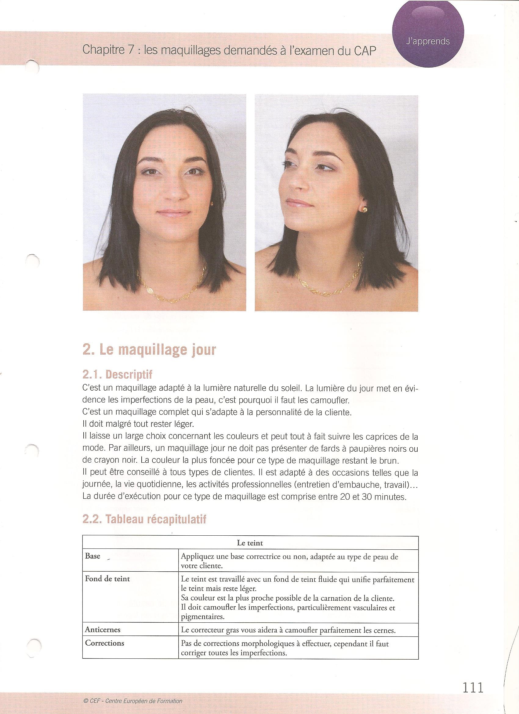 maquillage jour : FDT , correction imperfection , poudre libre, Fard a paupière (blanc cassé coin internet + 1couleur clair coin externe ) blush , rouge a levre ou gloss