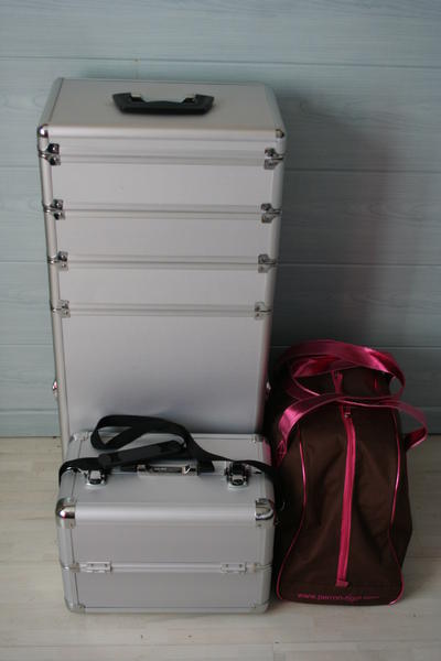 J'ai un trolley où j'ai mis en haut dans la malette détachable, le maquillage, deuxième étage, matos pour BDM/BDP, et en bas, un bac de rangement avec tous les vernis, bien rangés, le matos épil dans un autre bac de rangement, la rallonge.