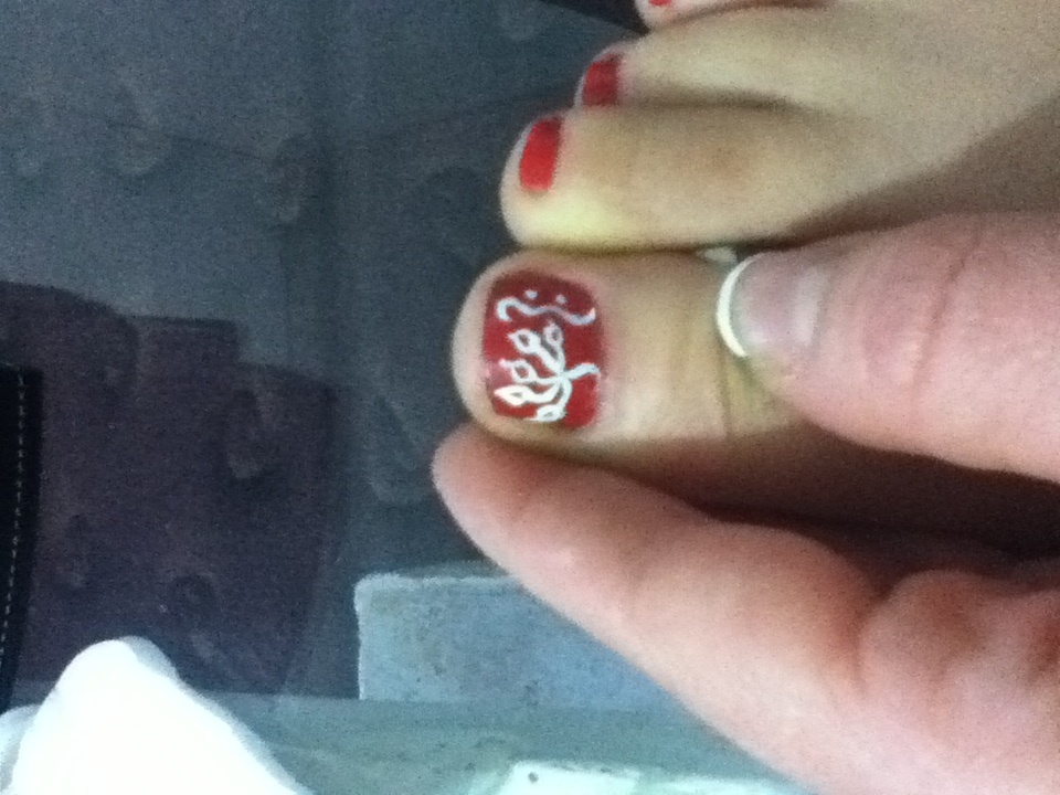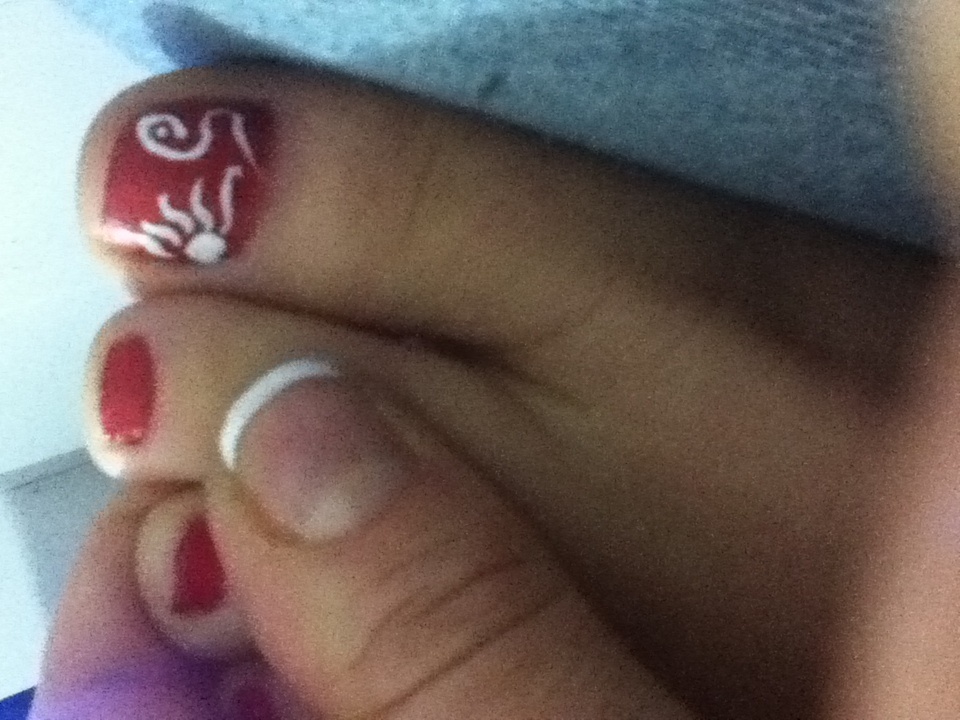 Et ça c'est mes motifs gros orteils... Pffff... Sur le vernis. Je manque d'imagination, je sais pas trop quoi dessiner. Et je trouve ça trop encombrant et le trait pas assez fin. J'aimerais vraiment tomber sur un maquillage visage. Mais ça je peut pas prévoir . Faut que je m'entraîne . Merci amandine de tes conseils. J'essaierai aussi avec du meilleur vernis. Pour la french vernis de gifi ( lol) et j'ai acheté qu'un liner blanc pour l'instant pour déjà me faire la main. Il paraît qu'avec l'acrylique c plus faciles