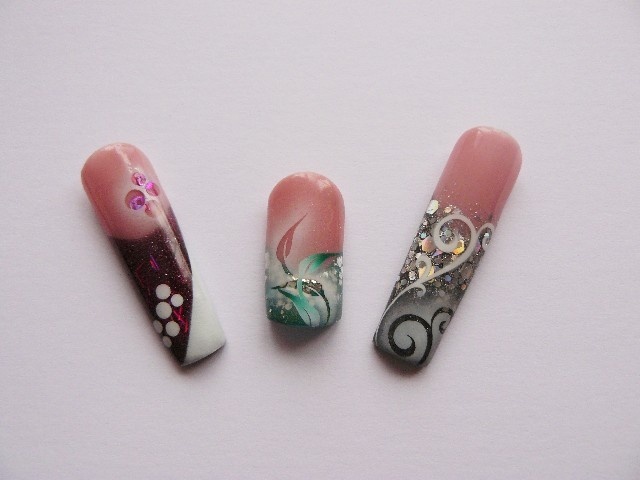 Grise : rallongement cover Ef-Exclusive, gel n°55 Boutiknails, mix paillettes Boutiknails, dessin airbrush