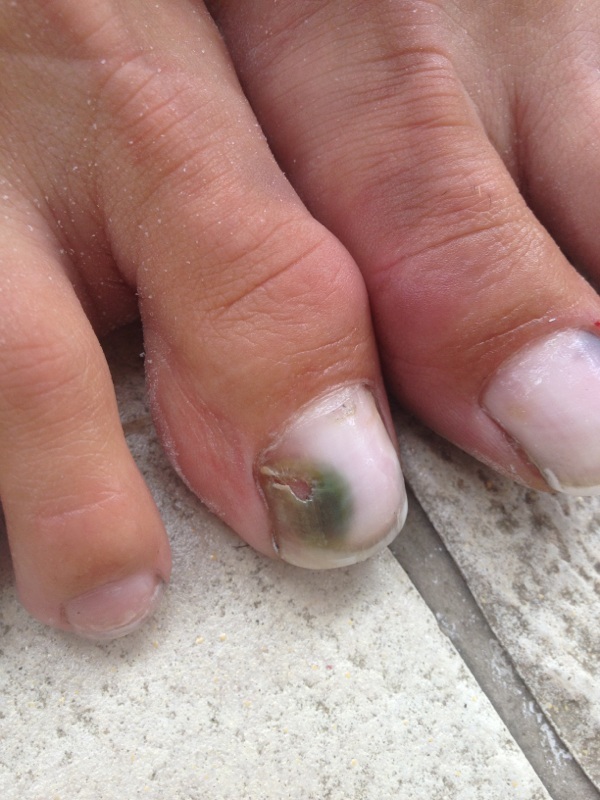 Voilà ma cliente du jour , une ancienne copine qui avait sa po depuis 5 ans et qui a voulu tester mes prestations . Donc dépose des mains .. Un carnage les ongles bousillés (pas par moi ) la p o d avant à chaque remplissage limait la totalité en entamant à chaque fois sa plaque naturelle . Elle appliquait direct le gel couleur à même l ongle (sans base ni rien elle avait une sorte de french a 2 couleur ) du coup toutes les 2/3 semaines elle enlevait tout pour refaire .. Des trous pleins les ongles .. Mais la cerise sur le gâteau c est après lui avoir fait les mains elle m à demander de jeter un coup d œil aux pieds ... Et la l horreur !! J ai direct déposer son gainage pour remettre l ongle à nu mais j ai arrêter sur le pieds droit car l ongle tellement pourri était entrain de tombé .. Beurk après explication avec l ancienne po elle avait effectivement vu une tâche au remplissage mais avait coller un stikers dessus ..très pro la fille ( elle pratique depuis 6 ans )enfin voilà les images parle d elle même ..