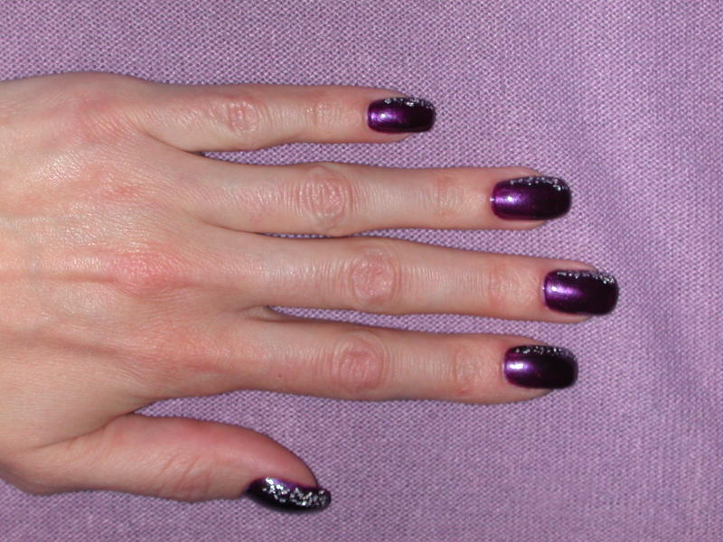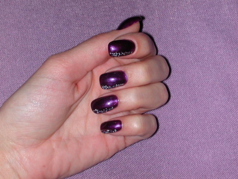 voila, marre de ma pose "rose degoulinant", alors j'ai poncé un petit peu, et mis une couche de vernis violet nacré, et de la feuille d'argent (recouvert de gel de finition)