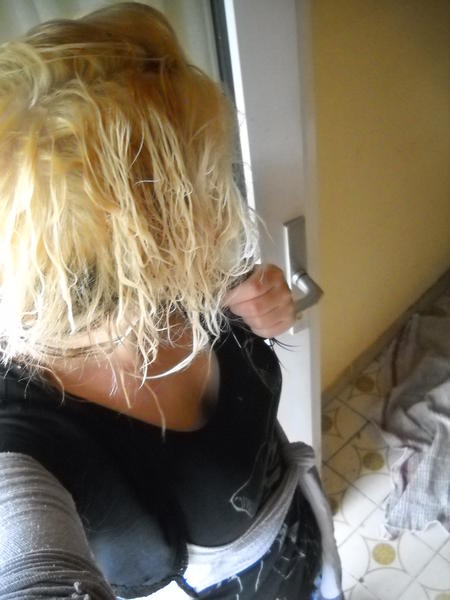 bon essai sur les extensions.. elles ont bien éclairci donc là poudre bleue+30vol qui pose sur ma tete encore 30min lol je rince je sèche et je poste déjà le avant/pendant ^^