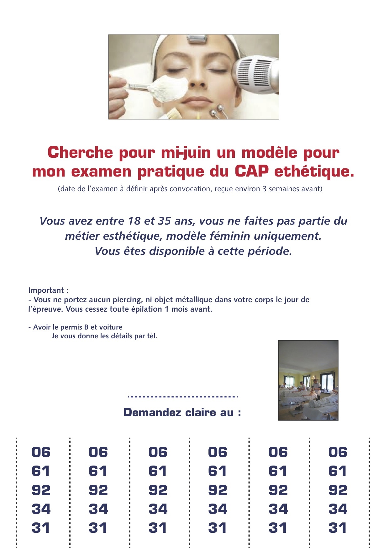 ClaireCh Membre Actif CAP ESTHETIQUE 16 Janvier 2014 #1 Ci-joint les détails dans ce document joint l'examen aura lieu en principe à Reims (51) Pièces jointes exam modele.jpg 309.5 KB · Affichages: 118