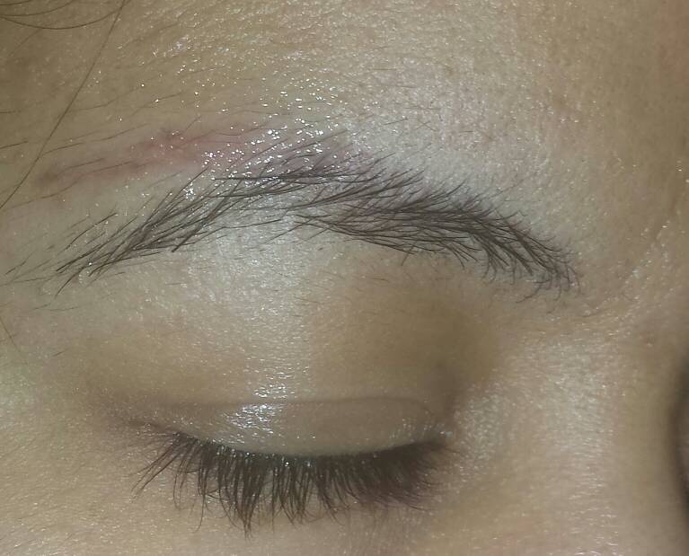 2 semaines de croutes horribles sur les sourcils (en mode dentifrice les 2 premiers jours puis croutes orangées verdatres les 10-12 jours suivants) puis une fois les croutes tombées une rougeur spectaculaire, avec pores dilatées, boursouflures par endroits et creux dans d'autres endroits et ce depuis maintenant 3 semaines. Je mets de l'huile de calendula pour favoriser la cicatrisation et j'ai aussi appliquer par intermittence un peu de miel bio sur les aimables conseils de Sophieyo...
