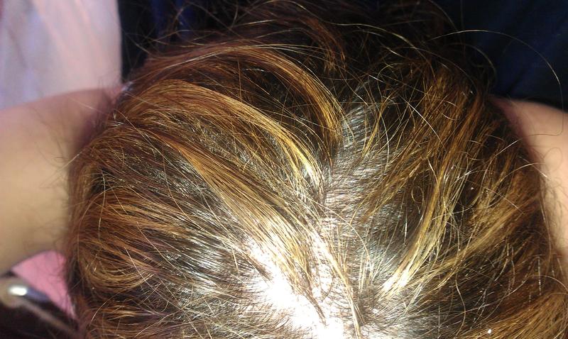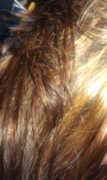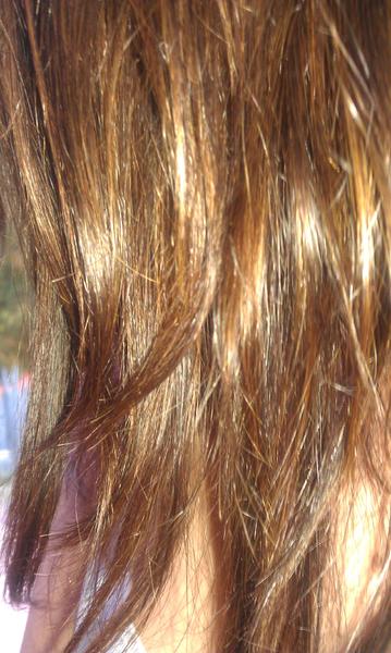je vous met aussi une photo de mes cheveux..petite précision la couleur est un peu moins clair (flash appareil photo), et les meches ont moins prises sur les longueurs